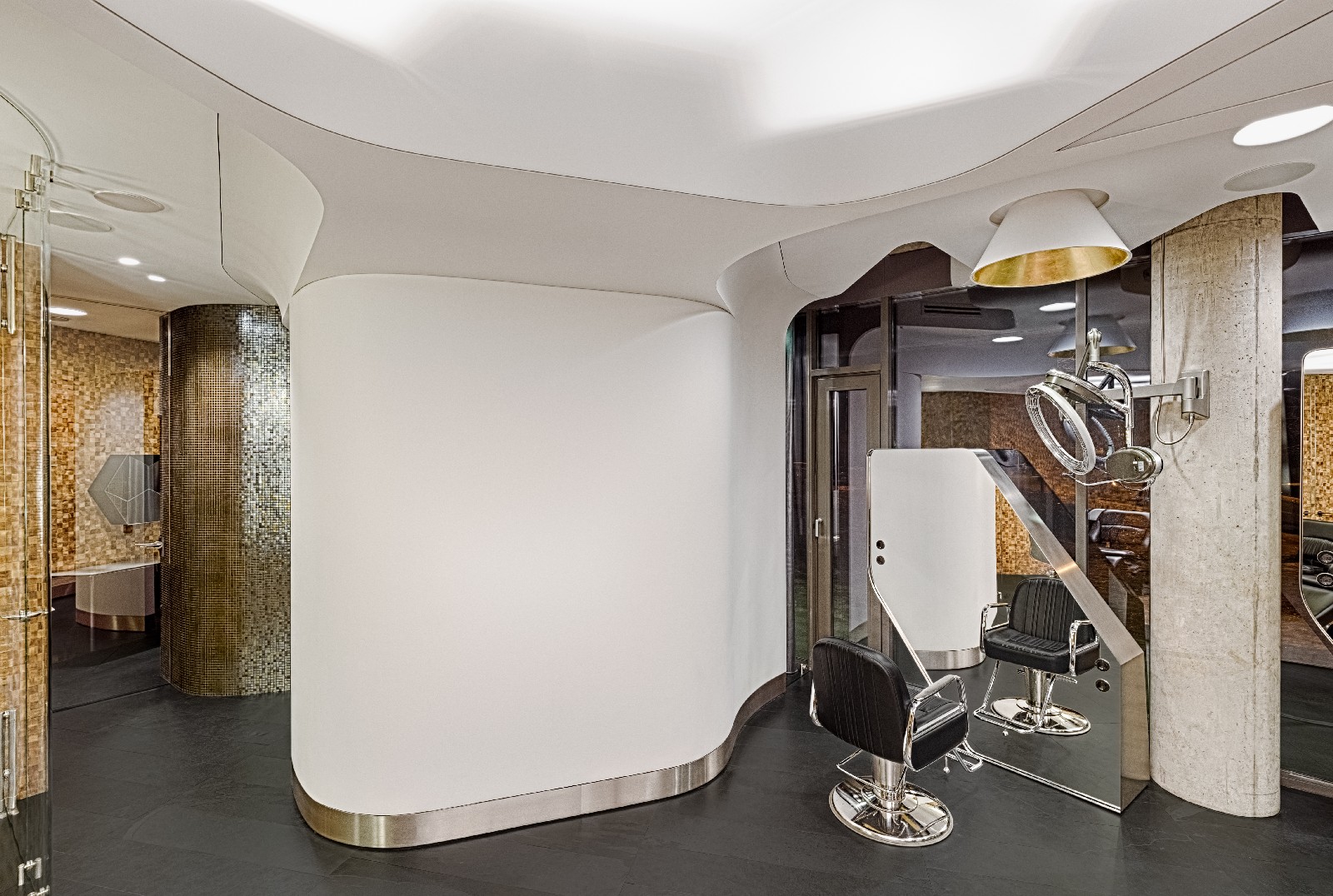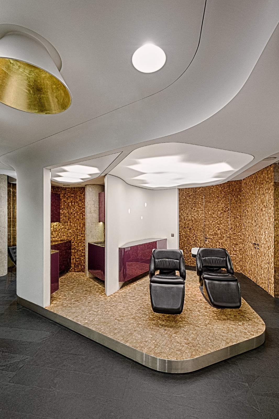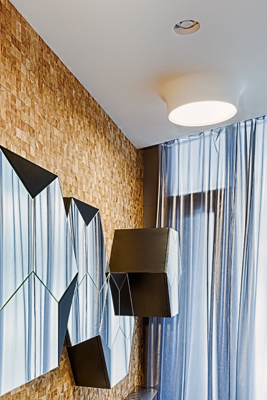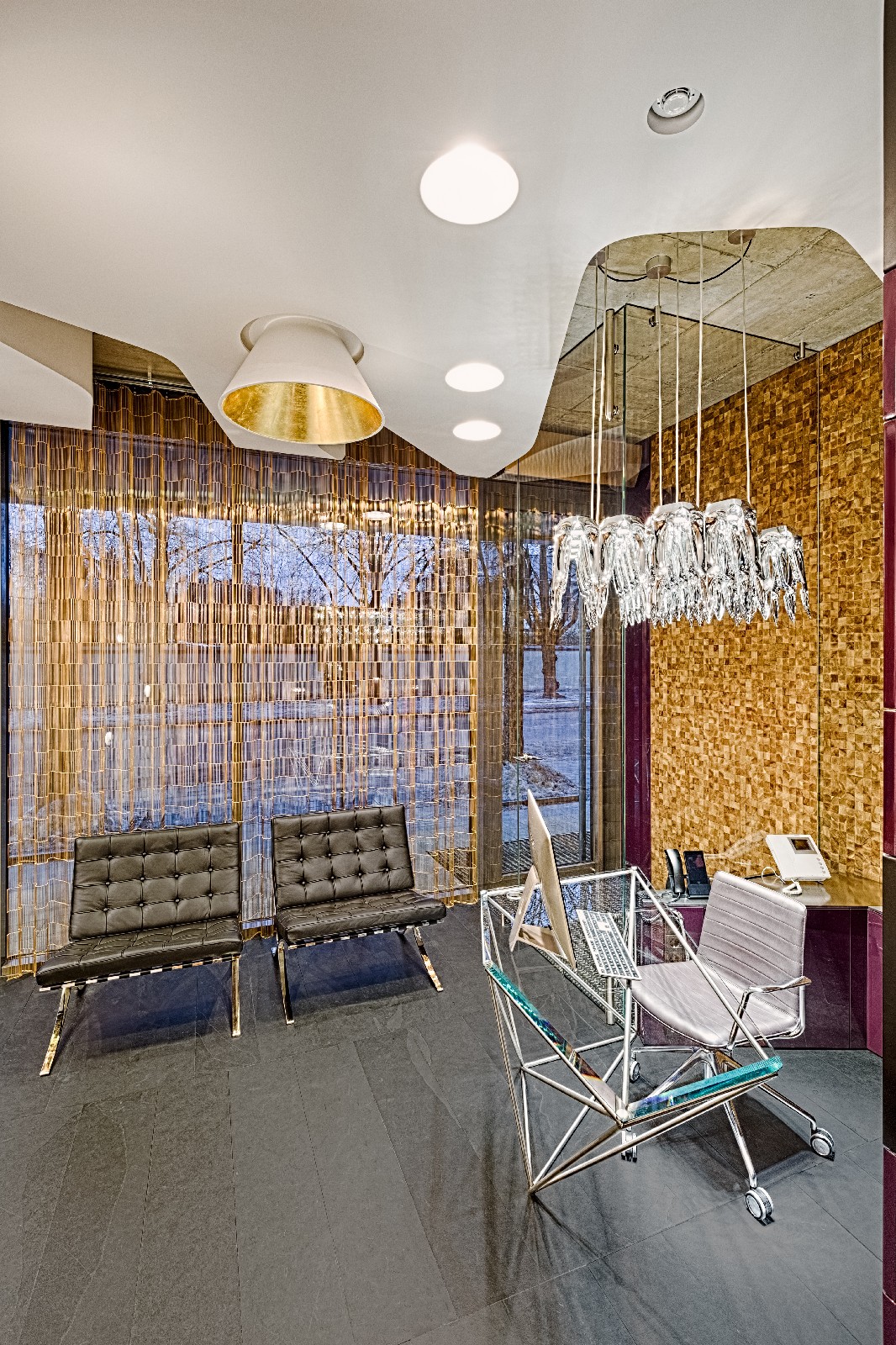 Dėl įvairių ant lubų esančių bioninių kreivių, formuojančių medžio lają ir savo plastika kontrastuojančių su atvira gelžbetonio perdanga, architektai sukūrė tūrio erdvę taip, kad lankytojai suvokia ją tarsi per vadinamąjį „žuvies akies“ (angl. fisheye) objektyvą. Kreivių gausa yra objekto dominantė, kuri esant įvairioms perspektyvoms susilieja su gipsiniais FLOS šviestuvais, primenančiais rojaus vaisius – tam jų vidinė pusė dekoruota aukso patalijos plokštelėmis, dėl kurių šviesa sklinda paauksuotu srautu ant pintų metalo užuolaidų, sukurdama mistišką metalo žaižaravimo efektą. Tos pačios kreivės apipina ir „Performa“ architektų suprojektuotą bei įmonės „Gaudrė“ dizainerių pagamintą telefono išmaniąja programa valdomą išsklaidytos šviesos sistemą „korys“. Kintamo spektro šviesa ir pagrindinių spalvų gama atlieka ne tik stilistinę, bet ir šviesos terapijos funkciją.