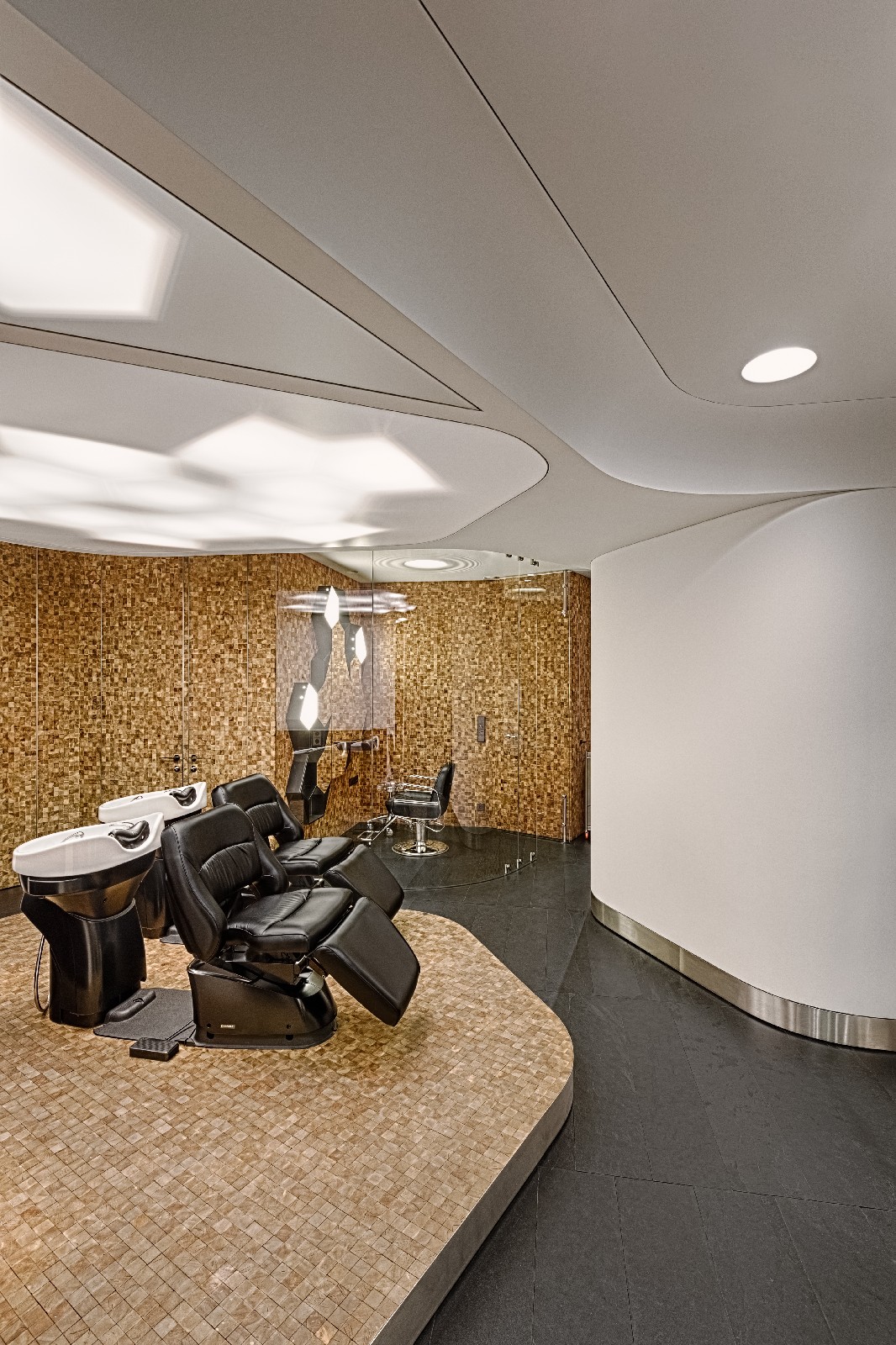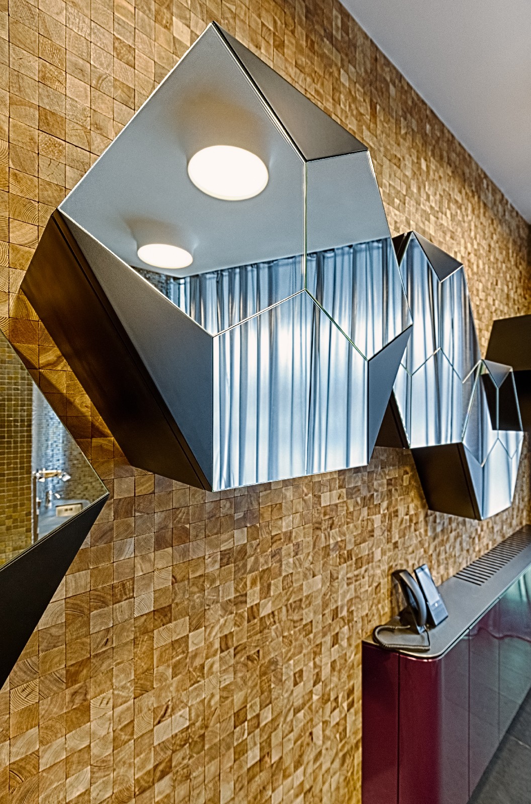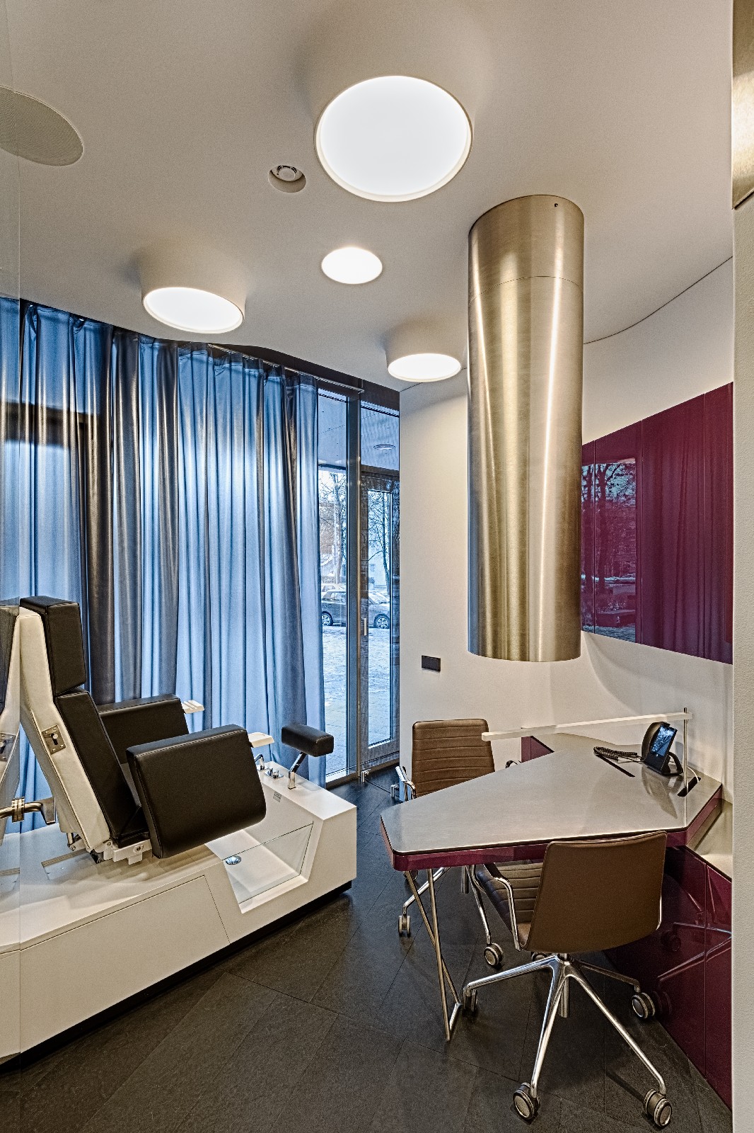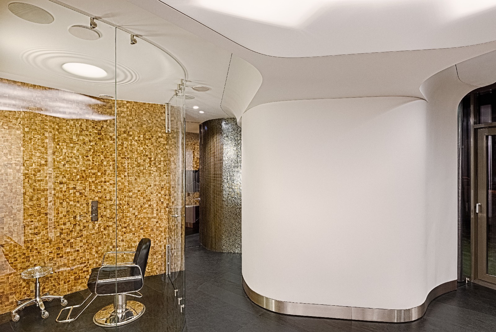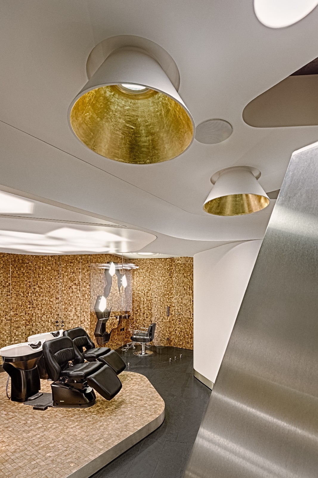 Dėl įvairių ant lubų esančių bioninių kreivių, formuojančių medžio lają ir savo plastika kontrastuojančių su atvira gelžbetonio perdanga, architektai sukūrė tūrio erdvę taip, kad lankytojai suvokia ją tarsi per vadinamąjį „žuvies akies“ (angl. fisheye) objektyvą. Kreivių gausa yra objekto dominantė, kuri esant įvairioms perspektyvoms susilieja su gipsiniais FLOS šviestuvais, primenančiais rojaus vaisius – tam jų vidinė pusė dekoruota aukso patalijos plokštelėmis, dėl kurių šviesa sklinda paauksuotu srautu ant pintų metalo užuolaidų, sukurdama mistišką metalo žaižaravimo efektą. Tos pačios kreivės apipina ir „Performa“ architektų suprojektuotą bei įmonės „Gaudrė“ dizainerių pagamintą telefono išmaniąja programa valdomą išsklaidytos šviesos sistemą „korys“. Kintamo spektro šviesa ir pagrindinių spalvų gama atlieka ne tik stilistinę, bet ir šviesos terapijos funkciją.