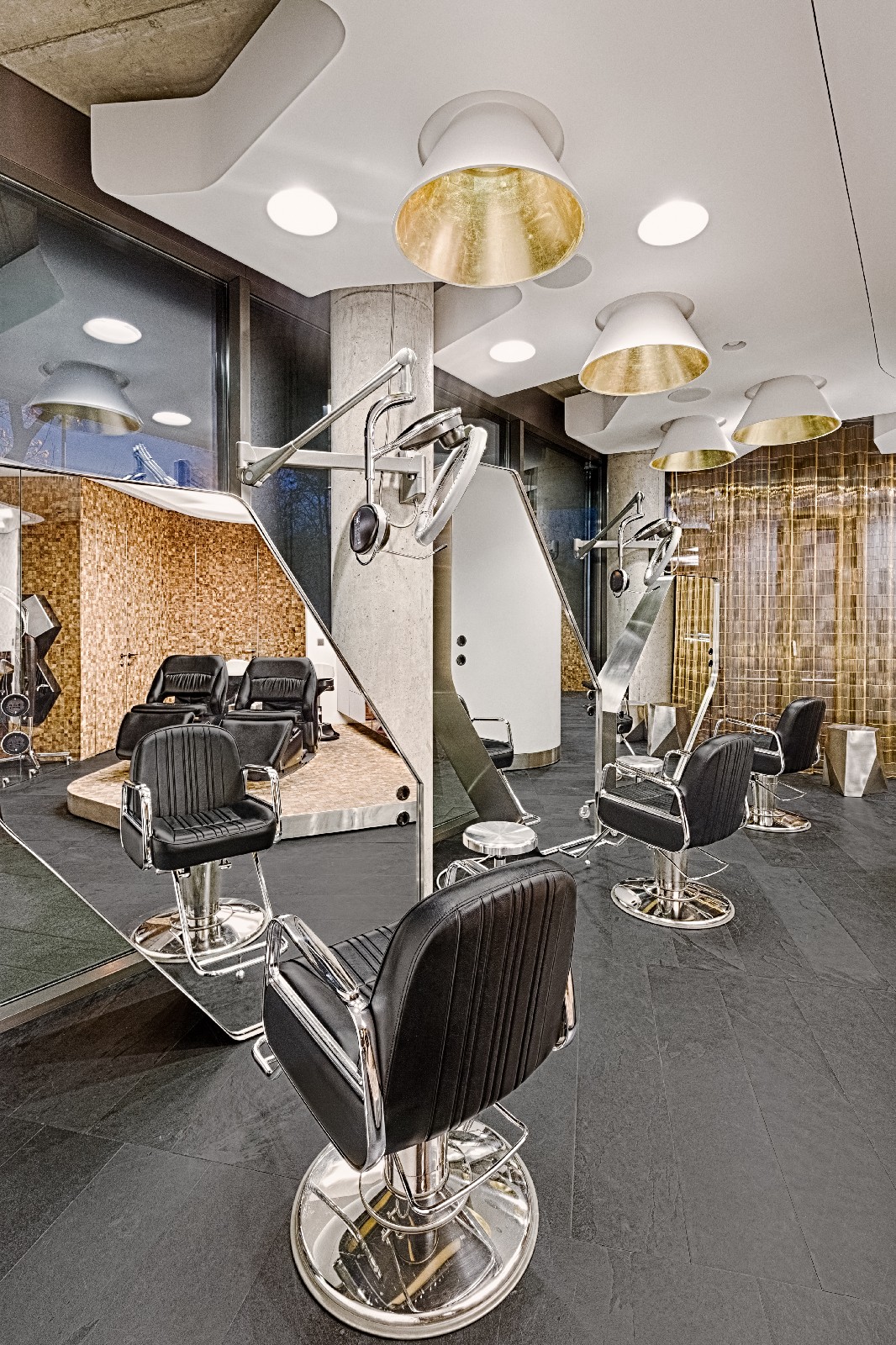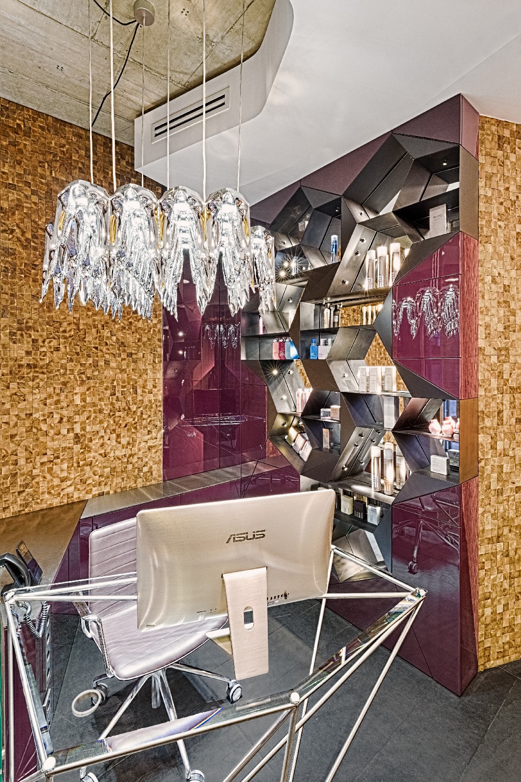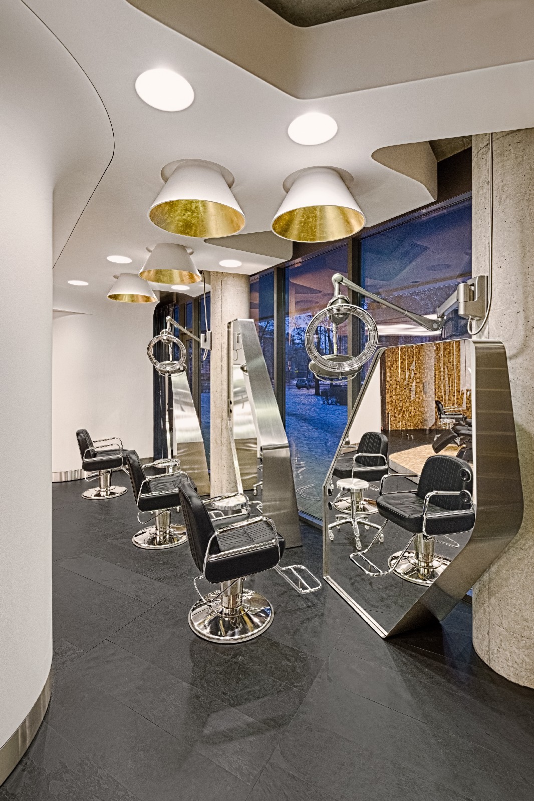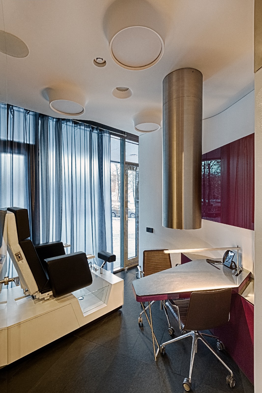 Dėl įvairių ant lubų esančių bioninių kreivių, formuojančių medžio lają ir savo plastika kontrastuojančių su atvira gelžbetonio perdanga, architektai sukūrė tūrio erdvę taip, kad lankytojai suvokia ją tarsi per vadinamąjį „žuvies akies“ (angl. fisheye) objektyvą. Kreivių gausa yra objekto dominantė, kuri esant įvairioms perspektyvoms susilieja su gipsiniais FLOS šviestuvais, primenančiais rojaus vaisius – tam jų vidinė pusė dekoruota aukso patalijos plokštelėmis, dėl kurių šviesa sklinda paauksuotu srautu ant pintų metalo užuolaidų, sukurdama mistišką metalo žaižaravimo efektą. Tos pačios kreivės apipina ir „Performa“ architektų suprojektuotą bei įmonės „Gaudrė“ dizainerių pagamintą telefono išmaniąja programa valdomą išsklaidytos šviesos sistemą „korys“. Kintamo spektro šviesa ir pagrindinių spalvų gama atlieka ne tik stilistinę, bet ir šviesos terapijos funkciją.