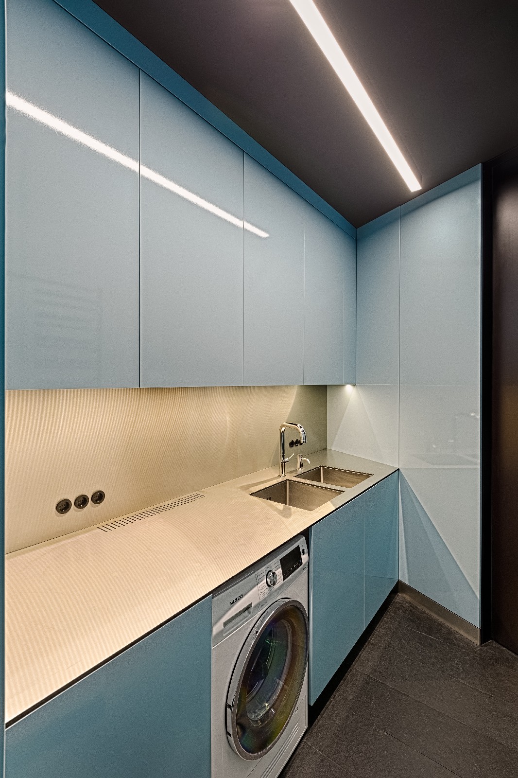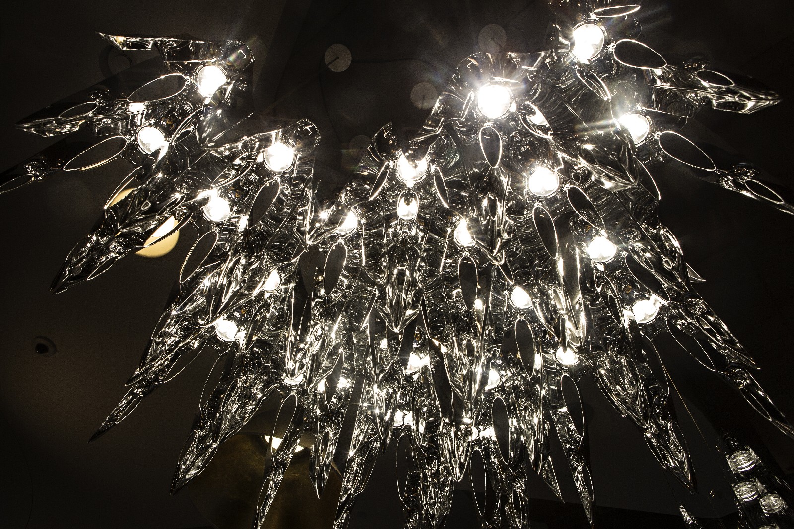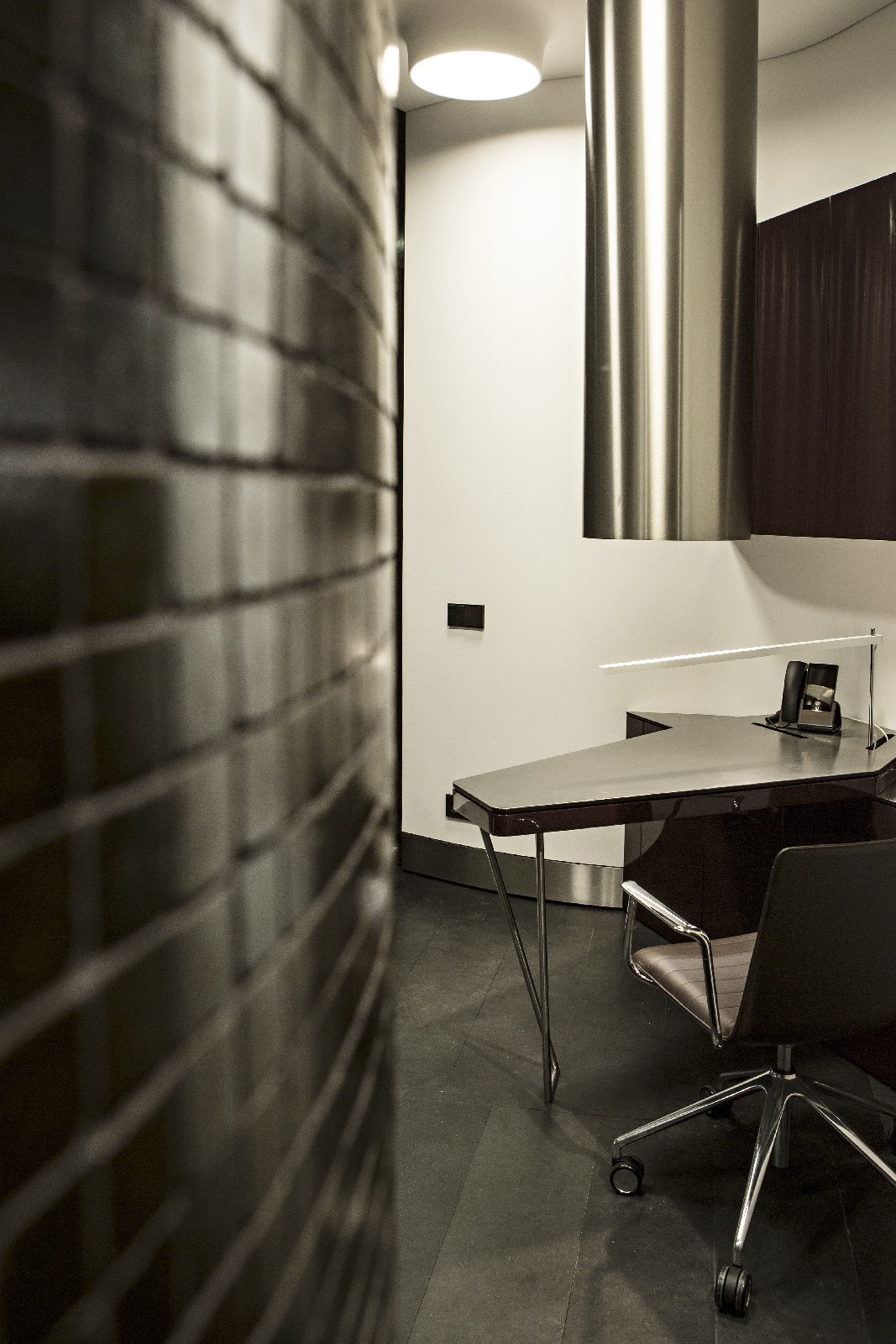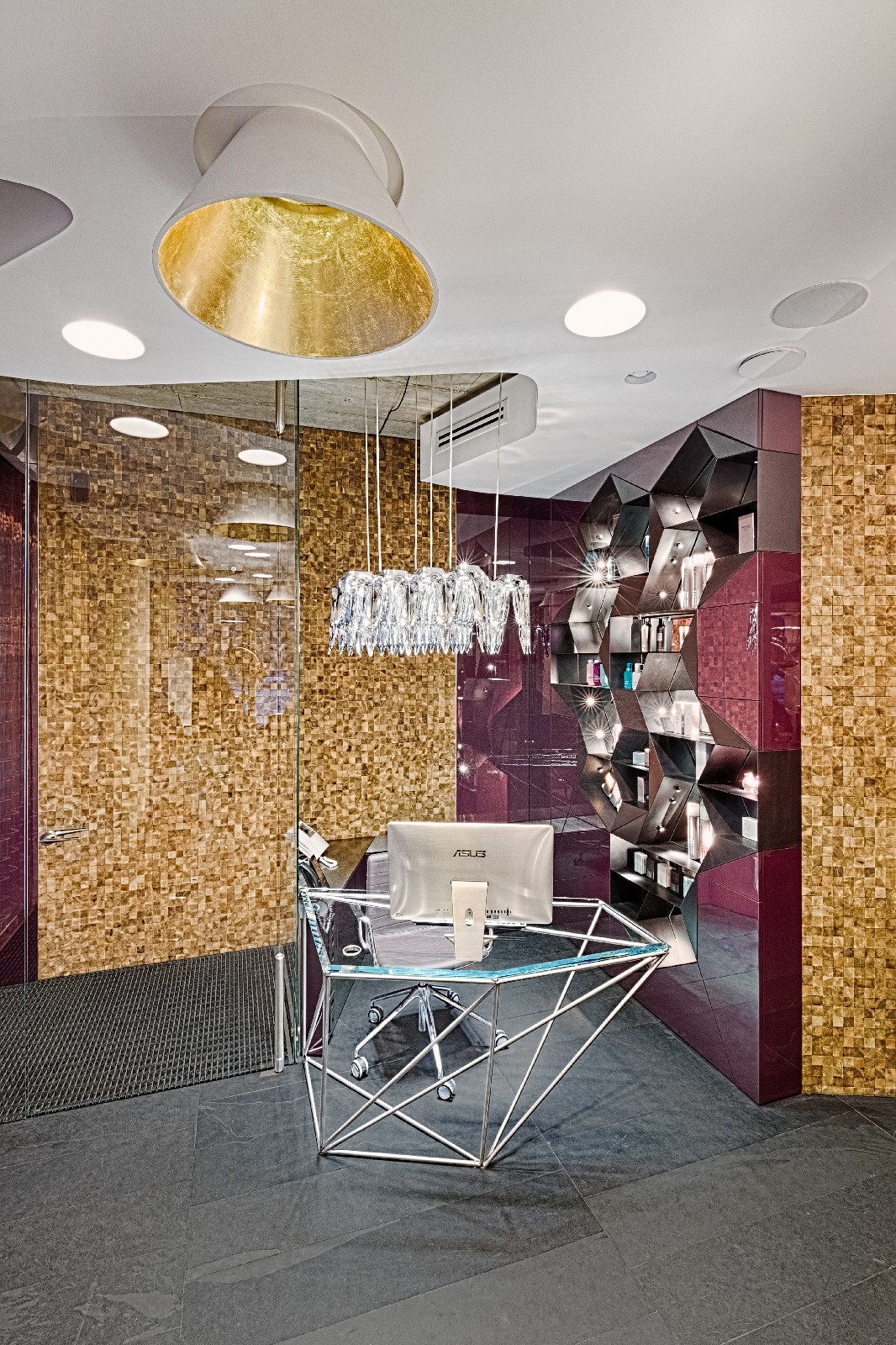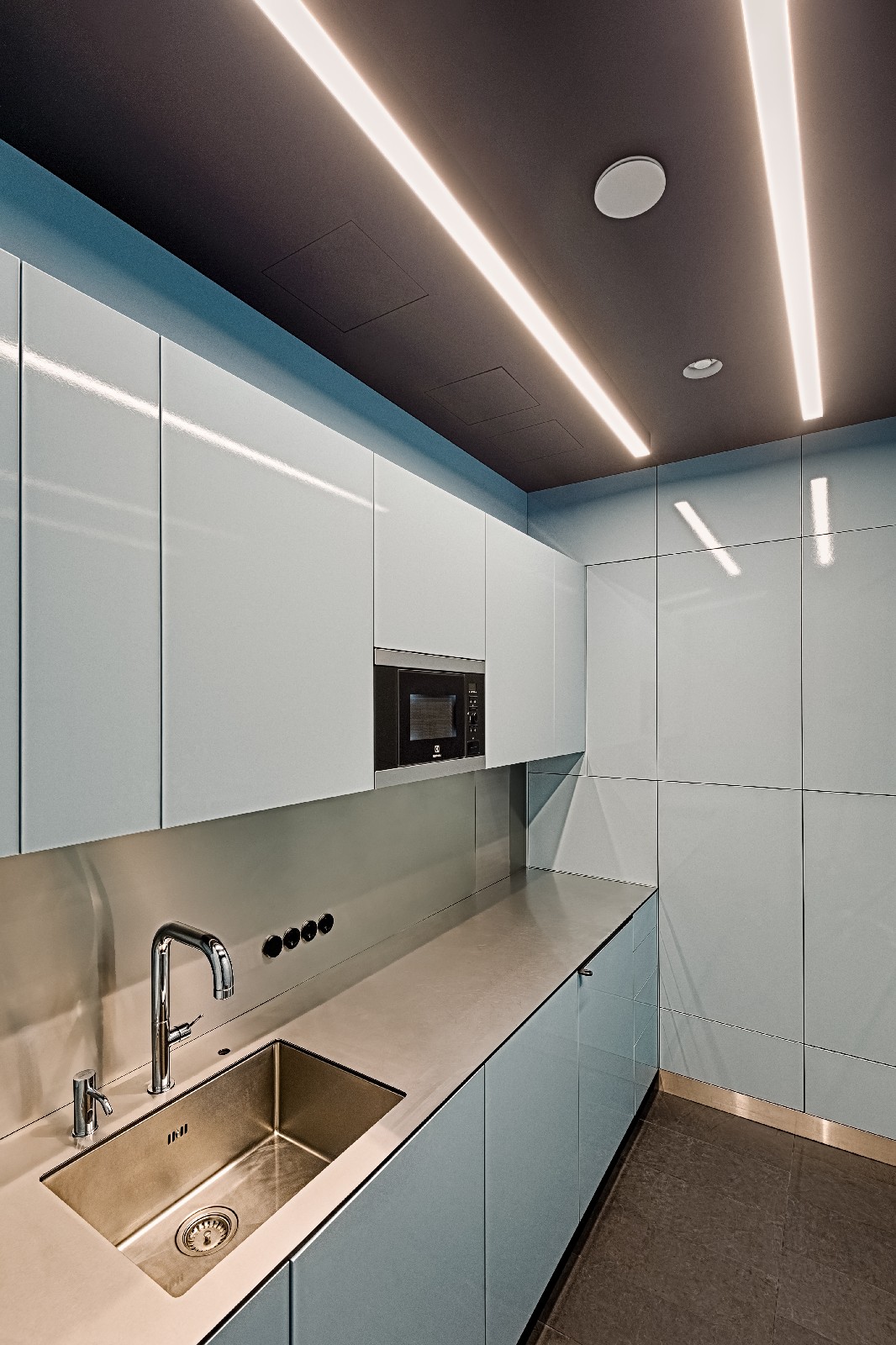 Dėl įvairių ant lubų esančių bioninių kreivių, formuojančių medžio lają ir savo plastika kontrastuojančių su atvira gelžbetonio perdanga, architektai sukūrė tūrio erdvę taip, kad lankytojai suvokia ją tarsi per vadinamąjį „žuvies akies“ (angl. fisheye) objektyvą. Kreivių gausa yra objekto dominantė, kuri esant įvairioms perspektyvoms susilieja su gipsiniais FLOS šviestuvais, primenančiais rojaus vaisius – tam jų vidinė pusė dekoruota aukso patalijos plokštelėmis, dėl kurių šviesa sklinda paauksuotu srautu ant pintų metalo užuolaidų, sukurdama mistišką metalo žaižaravimo efektą. Tos pačios kreivės apipina ir „Performa“ architektų suprojektuotą bei įmonės „Gaudrė“ dizainerių pagamintą telefono išmaniąja programa valdomą išsklaidytos šviesos sistemą „korys“. Kintamo spektro šviesa ir pagrindinių spalvų gama atlieka ne tik stilistinę, bet ir šviesos terapijos funkciją.