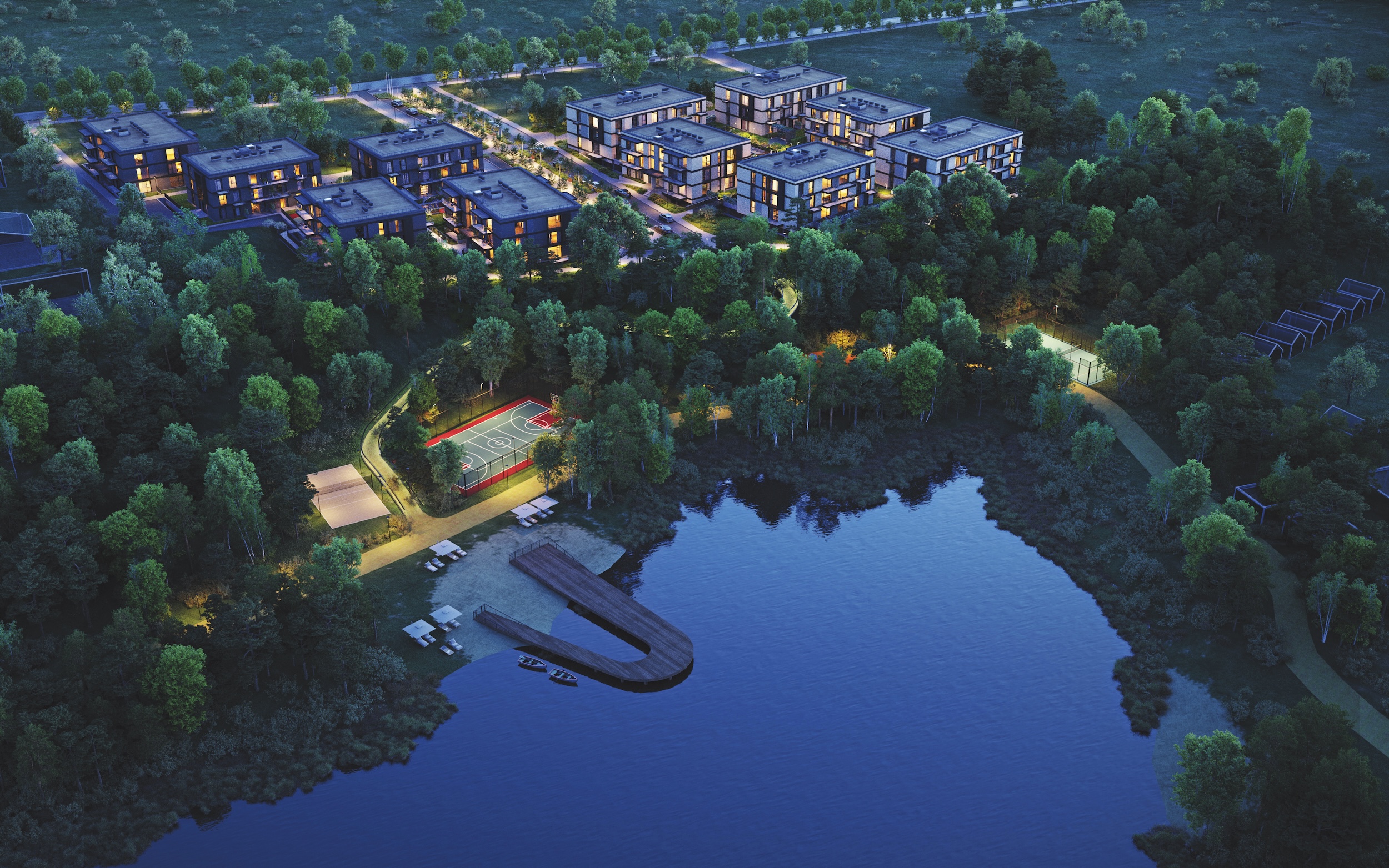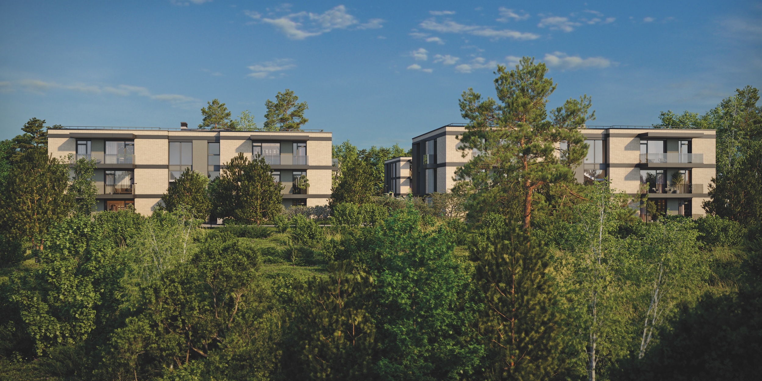E. Mesengiser-Garber teigimu, žemi, žmogui artimo mastelio, pastatai darniai įsilieja į želdynų gausią aplinką. Dideli langai užtikrina maksimalų natūralios šviesos panaudojimą ir atveria greta ošiančio saugomo natūralaus miško bei tvenkinio panoramą. Aukščiau gyvenantieji ja galės grožėtis ir iš netipinių 180 cm pločio balkonų, o pirmojo aukšto gyventojai – iš didelių terasų. Nutiesti kokybiški pėsčiųjų ir dviračių takai, poilsio zonos kvies laisvalaikį leisti lauke ir skatins sveiką gyvenseną. Antra vertus, gyventojus džiugins puikiai išplėtota urbanistinė infrastruktūra: keliai, mokyklos, parduotuvės, paslaugų teikimo vietos.