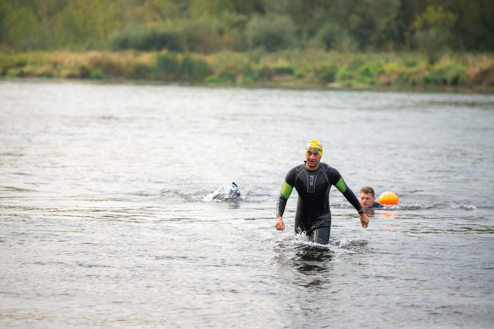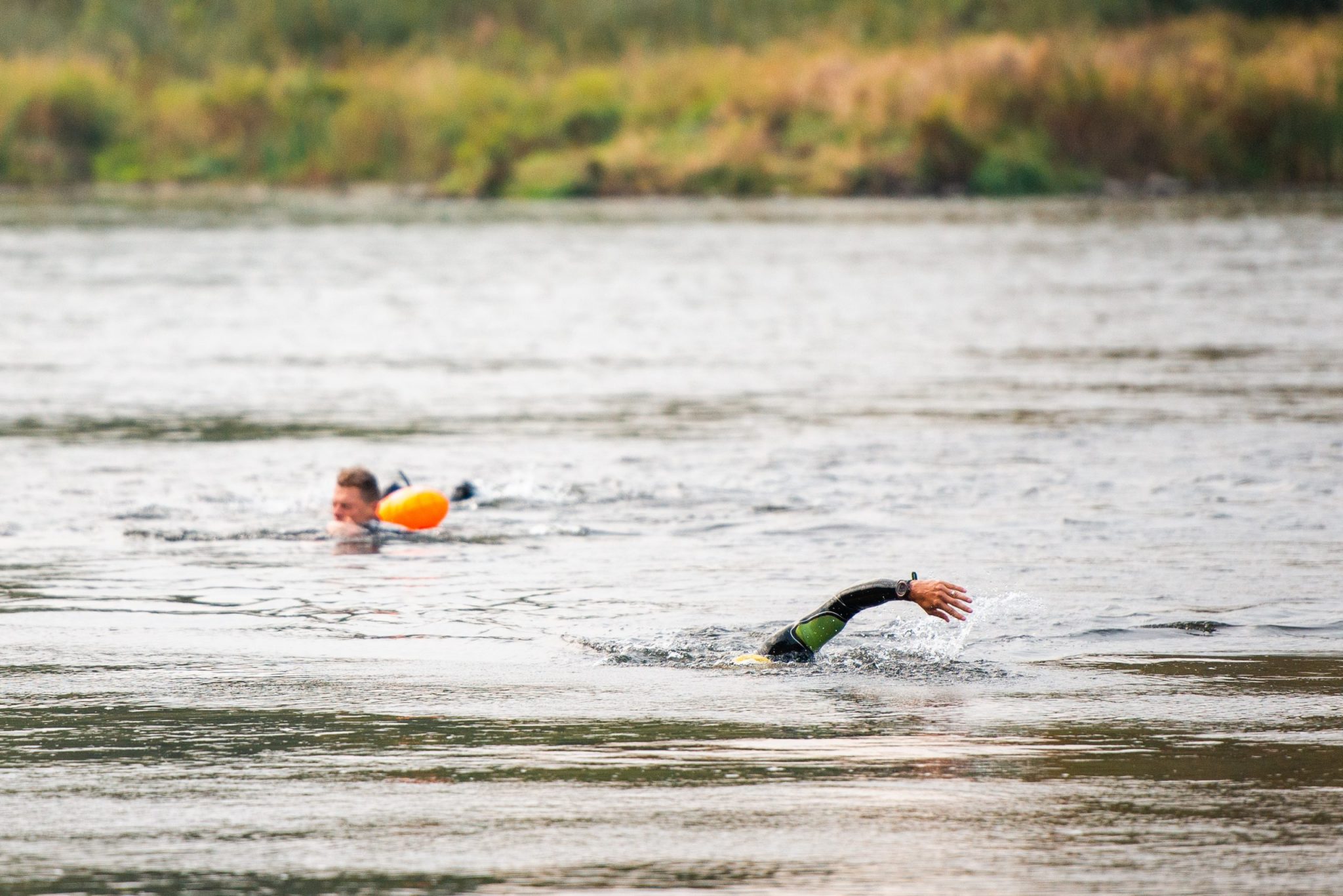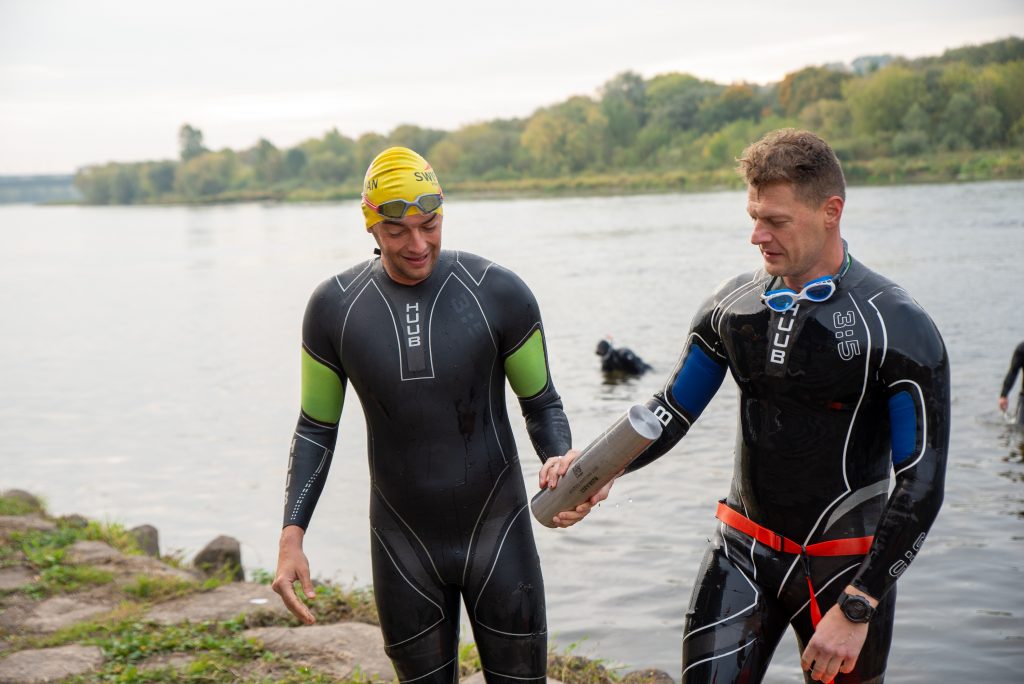Triatlonininkai Vaidas Velutis ir Tadas Šlentneris drauge su trimis Kauno Priešgaisrinės gelbėjimo valdybos pareigūnais per 10 minučių nuo M. K. Čiurlionio tilto prieigų upe atplukdė pagrindinį renginio akcentą – metalinę kapsulę.