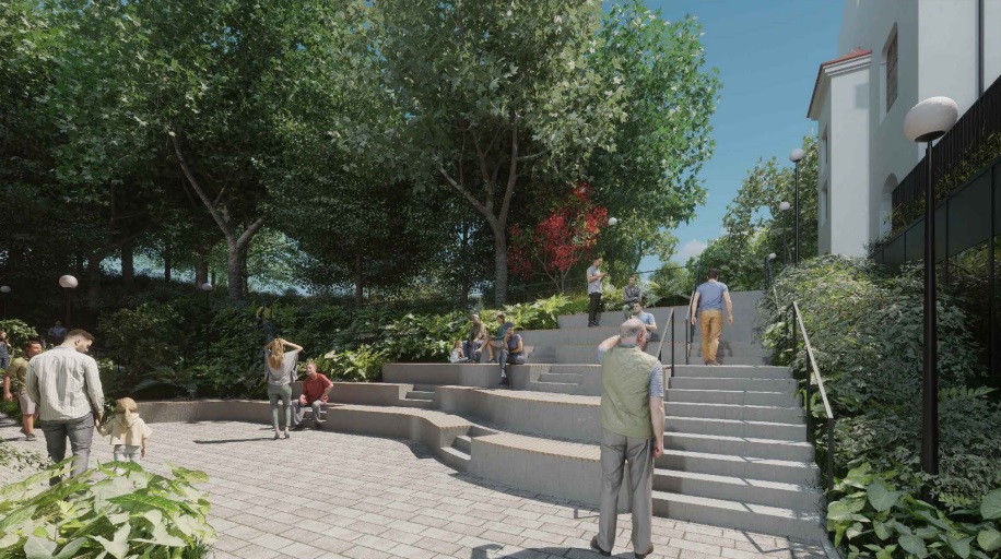 „Bauland“ parengtuose projektiniuose pasiūlymuose skveras formuojamas amfiteatro principu. Pagal universalaus dizaino principus sukurtas per visą teritoriją vingiuojantis pagrindinis pėsčiųjų ir dviračių takas bus skirtas ne tik susisiekimui, bet ir apjungs nedideles poilsio erdves, leis apžvelgti teritoriją iš įvairių perspektyvų ir aukščio. Takas sujungs ir kelias apžvalgos terasas.