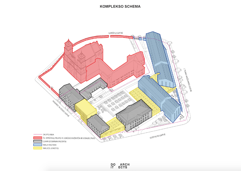Komplekso perimetrą „Do architects“ komanda stengėsi padaryti gyvastingą, atskleidžiantį naują gyvenimą, matomą ir pro šalį einančių žmonių, rūpinosi, kad jo naudojimo scenarijus būtų įdomus ir prašalaičiui. Pabrėžta, kad net komplekso tvora projektuota taip, kad ne skirtų, o jungtų – kaip vienas ištisinis perimetras. Įgyvendinus projektą atviras taps ir nedaugelio matytas šio ansamblio kiemas. Architektai čia suplanavo viešą sodą su patogiais suoliukais, ant kurių įsitaisius bus galima klausytis bažnyčios kariljonų. Siūlomas ne tik apėjimas, bet ir įėjimą į kompleksą. Šiame viešame kieme galima architektūriškai pajusti mastelių skirtumą, bažnyčios dydį ir svorį, susiformavusius komplekso sluoksnius.