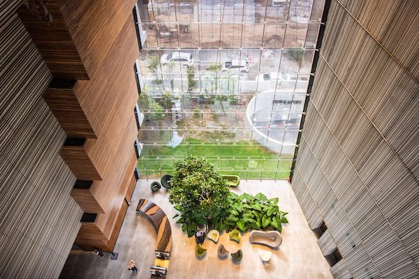 Į biurų pastatą įtrauktas įėjimas su 30 metrų aukščio erdve, kurioje pasodinti medžiai ir, kurią apšviečia pro stoglangį krentanti šviesa, taip pat restoranu ir vestibiuliu, vedančiu iki liftų.
