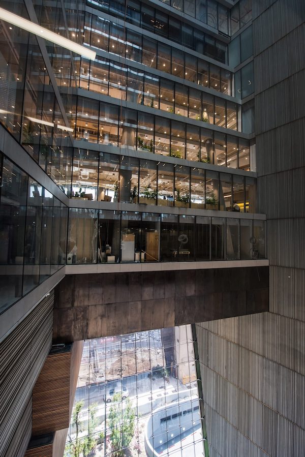 Į biurų pastatą įtrauktas įėjimas su 30 metrų aukščio erdve, kurioje pasodinti medžiai ir, kurią apšviečia pro stoglangį krentanti šviesa, taip pat restoranu ir vestibiuliu, vedančiu iki liftų.