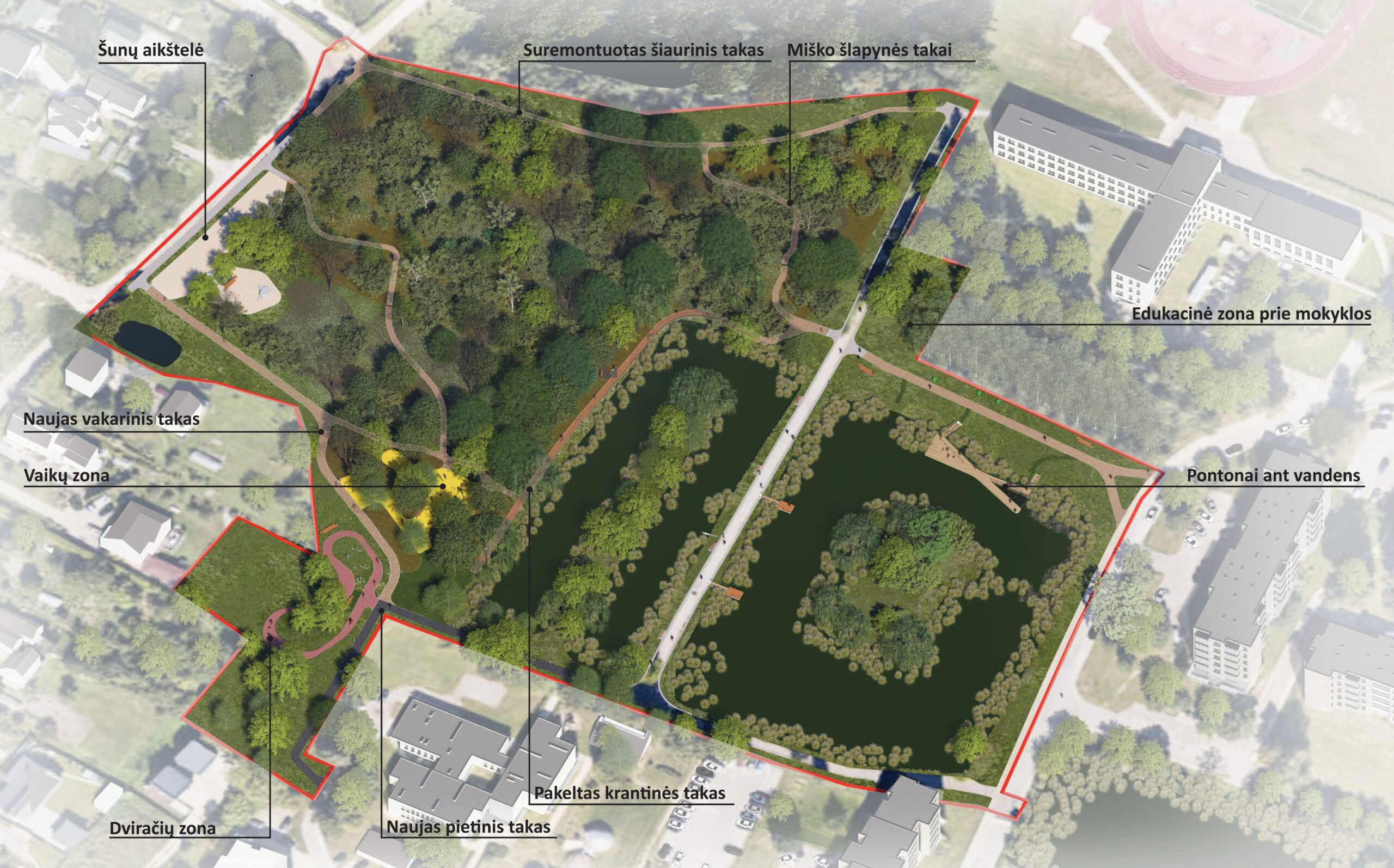 Teritorijoje esančios dvi kūdros bus tvarkomos ir valomos, sukuriant estetišką aplinką ir išlaikant jos ekologinę svarbą. Rytinės, didesnės kūdros krantinė erozijos pažeistose atkarpose bus tvirtinama akmenų ir kitokių natūralių priemonių, o prieiti ir prisėsti prie vandens kvies keli pontoniniai tilteliai. Šiaurinėje šios kūdros dalyje, prie naujai formuojamo tako atsiras didesnė medinė pontoninė terasa, o palei taką tarp kūdrų – dar du mažesni liepteliai. Šalia, prie mokyklos esančiame miškelyje planuojama įrengti lauko klasę su suolais – čia bus galima organizuoti lauko edukacijas. Greta atsiras kliūčių ruožo žaidimų aikštelė.