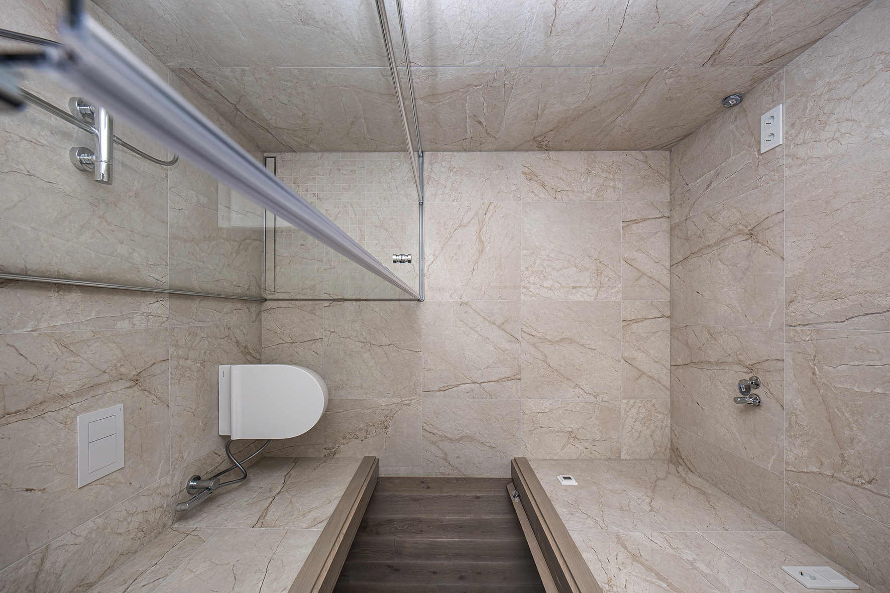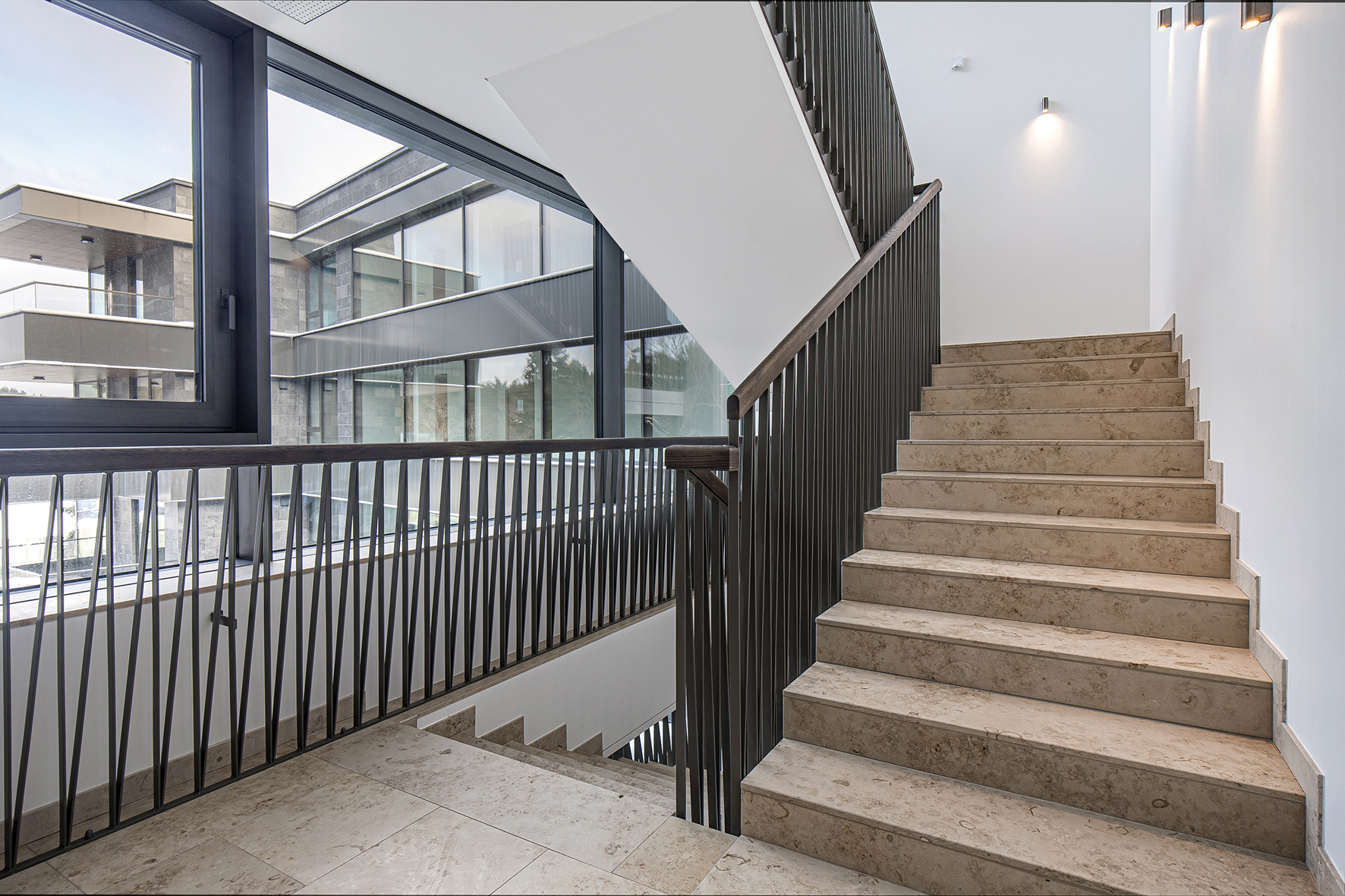 Šiame interjere nėra ryškiausių akcentų, formuojama vientisa nuotaika be jokių „išsišokimų“: šilumos ir taktiliškumo pojūtis mineralinių paviršių kontekste kuriamas mediniais porankiais, spalvinė gama sąmoningai rami ir santūri – natūralaus akmens, tamsaus metalo, medžio tonai. Kryptiniais šviesos srautais subtiliai pabrėžiamos šviesių sienų plokštumos ir architektūrinės linijos.