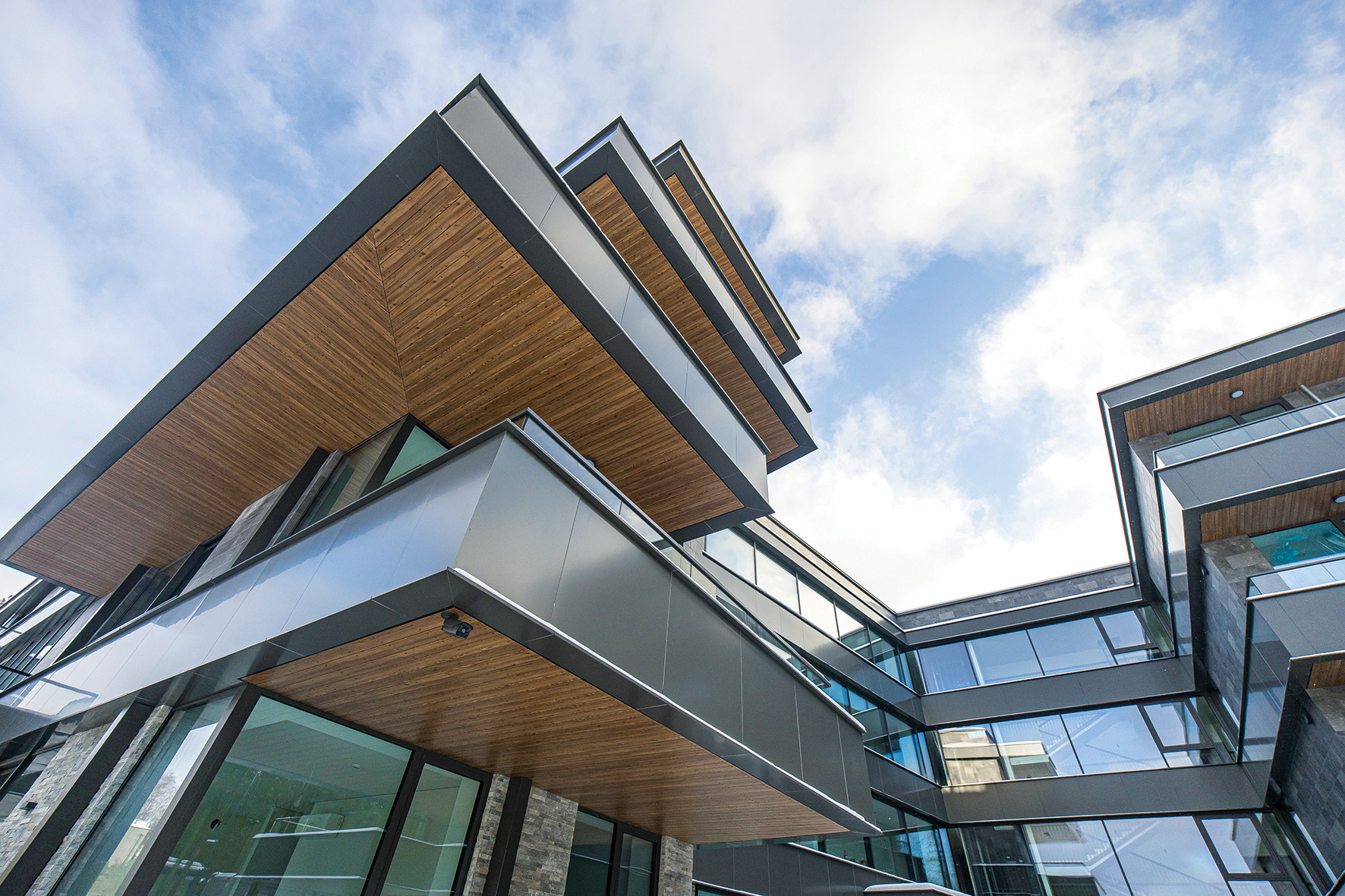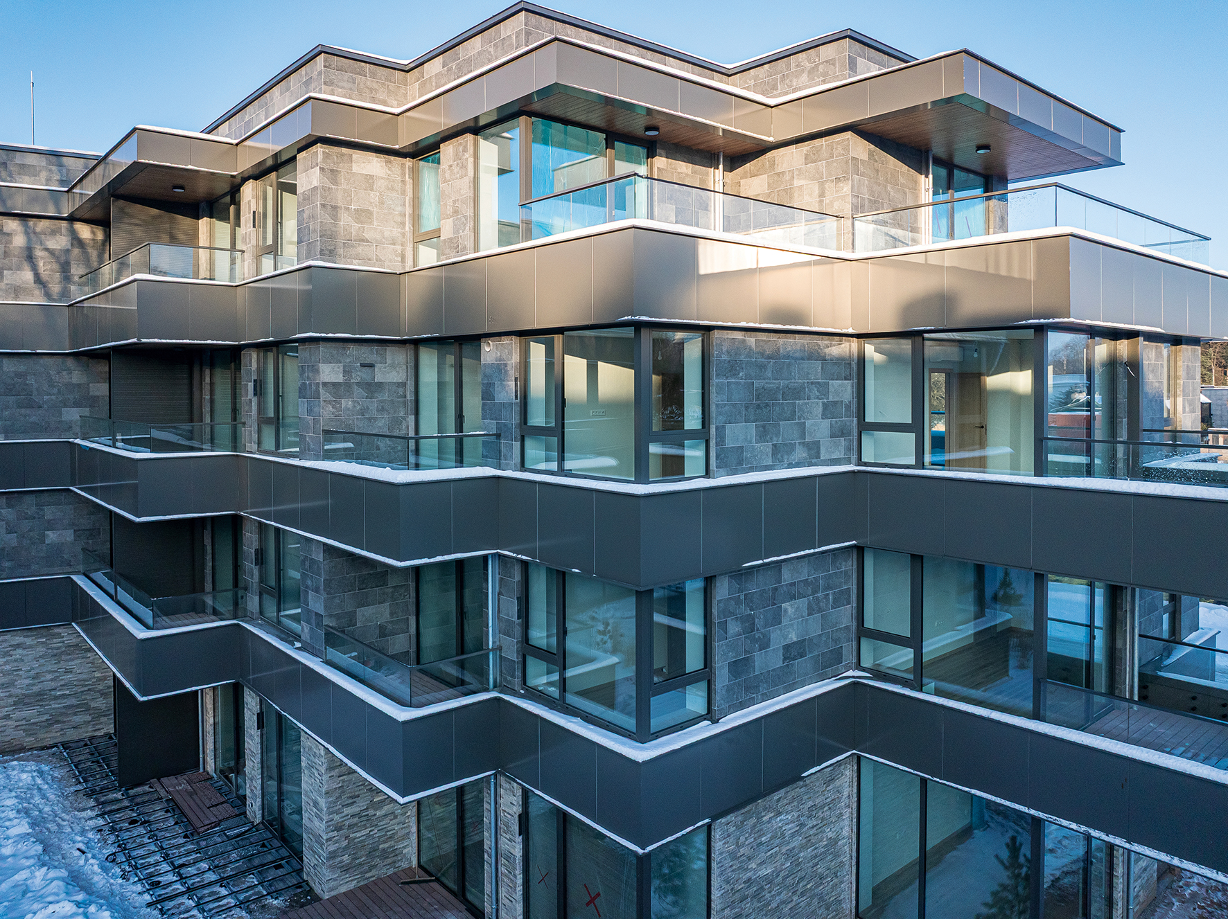 Fasado sprendiniui naudotos plėtotojų tiektos aukštos kokybės aliuminio kompozito plokštės – ilgaamžės, patikimos ir mažo svorio. Jos suteikia daug architektūrinių galimybių, tačiau jų montavimas yra techniškai sudėtingas ir reikalauja itin didelio tikslumo. Maža to, šiame objekte plokštės turėjo būti ir pjaustomos, lankstomos bei klijuojamos, o tam reikėjo ir specialių įrankių, ir patyrusių specialistų: nors technologiškai leidžiamas nuokrypis iki 3 mm, užsakovas pageidavo visus sprendinius įgyvendinti 1 mm tikslumu.