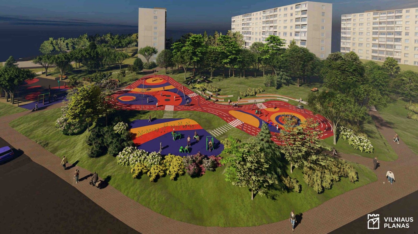 Teritorijoje ties Žirmūnų g. 111B iki 2026 m. pabaigos bus sutvarkyta beveik 1 ha viešoji erdvė. Planuojama atnaujinti pėsčiųjų takus, krepšinio aikštelę, želdinius, įrengti naujas vaikų žaidimų aikšteles, treniruoklių zoną, pavėsines, poilsio ir bendruomenės susibūrimo vietas. Aplink žaidimų erdves numatytas spalvingas 3 m pločio dviračių mokymosi takas, formuojamas kalvotas reljefas. Bus įrengta lauko treniruoklių zona vyresniems žmonėms, gertuvės, suolai, šiukšliadėžės, šachmatų ir stalo teniso stalai, apšvietimas. Šlaite planuojamos pasyvaus poilsio zonos su hamakais, amfiteatru, suolais-gultais ir renginių vieta su elektros įvadu.