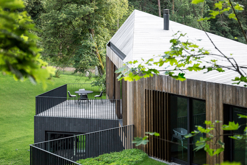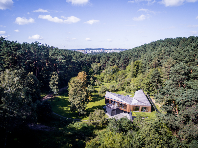Tiek daug procesą veikiančių faktorių, rodos, galėjusių nulemti visiškai kitokią šio projekto eigą ir rezultatą. Tačiau sumaniems kūrėjams viskas pavyko! „Pasiūlytas sprendinys maksimaliai atsitraukia į saulėtą pamiškės šlaitą. Naujas tūris projektuojamas buvusios sodybos vietoje. Išsaugomas esamas šlaitas bei visi sklype esantys vertingi medžiai. Pastatas tarsi „pakimba“ virš slėnio, atsiverdamas į jį ištisinėmis vitrinomis. Cokolinis aukštas dalinai slepiasi šlaite. Juodo skalūno apdaila padeda jam tarsi išnykti pamiškės šešėlyje. Eksponuojamas tik pirmo aukšto tūris, apdailintas natūraliu medžiu. Lakoniška, skulptūriška tūrių forma interpretuoja tradicinio dvišlaičio namo siluetą. Tūrio skaidymas, kintančios tūrių formos, humaniškos proporcijos, stiklo ir medžio dermė kuria lengvumo įspūdį. Vidinės erdvės atkartoja tūrio formas. Vientisa fasadų ir stogo natūralaus medžio apdaila kuria formos vientisumą. Medžiagiškai ir spalviškai tarpsta pamiškės ir šlaito fone. Skaidant tūrį kuriamos mikroerdvės – kiemai. Tai namas gamtoje. Tad ir visos pagrindinės patalpos turi išėjimus į lauko erdves. Jos išsidėsto skirtinguose lygiuose, kuria tiesioginio santykio ir privatumo pojūtį, leidžia mėgautis tiek rytine, tiek vakarine saule. O pirmojo aukšto konsoliškai prasikišantis tūris suformuoja ir dengtą terasą. Pirmo aukšto vitrinas dalinai dengia vertikalios medinės žaliuzės. Jos apsaugo pastatą nuo perkaitimo, kuria fasado ažūriškumą bei tampa neatsiejama interjero dalimi. Siekiant minimizuoti intervenciją į gamtinį slėnį, suprojektuotas apželdintas veja bei natūraliu granitu grįstas įvažiavimas iki pastato. Sklypą juosia ažūriška tvora, išsaugomi medžiai“, – kiekvieną detalę prisimindamas pasakoja architektas ir pabrėžia, kad pagrindinis siekis buvo maksimaliai išsaugoti išskirtinę gamtinę aplinką, gerbiant tradicijas, sukurti naują, šiuolaikinę architektūrinę raišką.