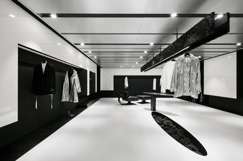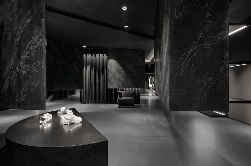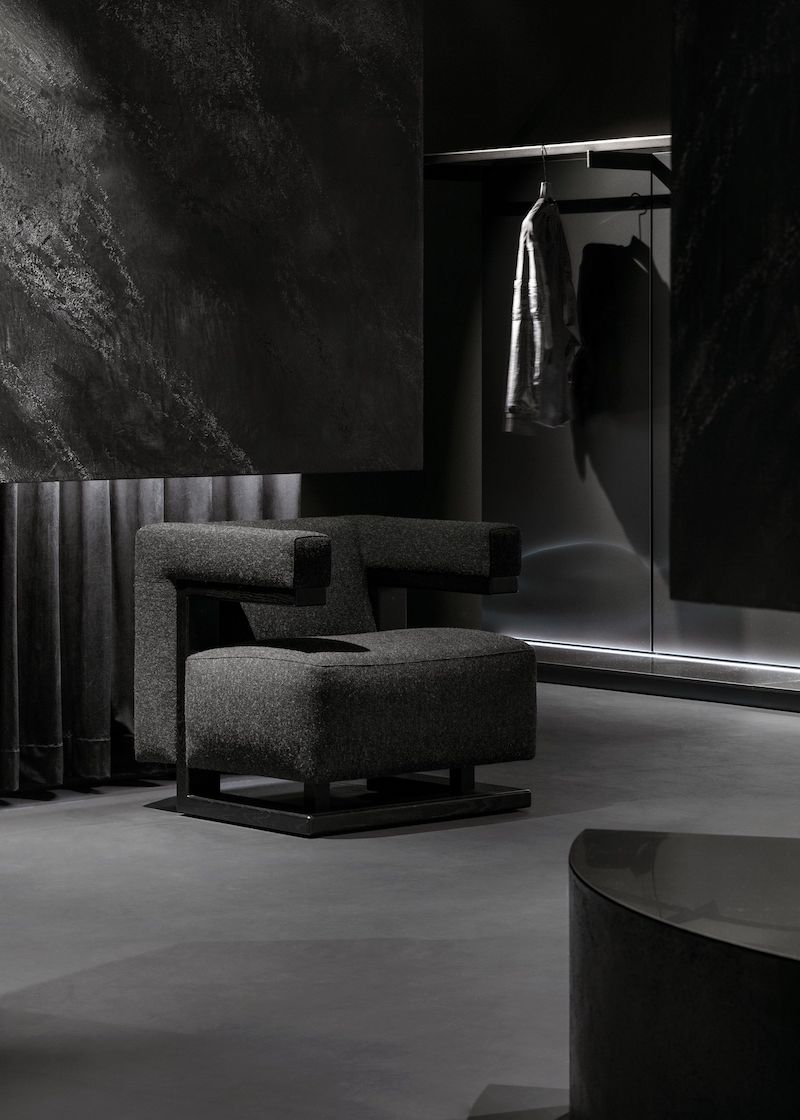 Tamsioje vyriškos aprangos erdvėje vyrauja kabančios geometrinės formos – stačiakampiai ekranai ir pusapvaliai elementai.