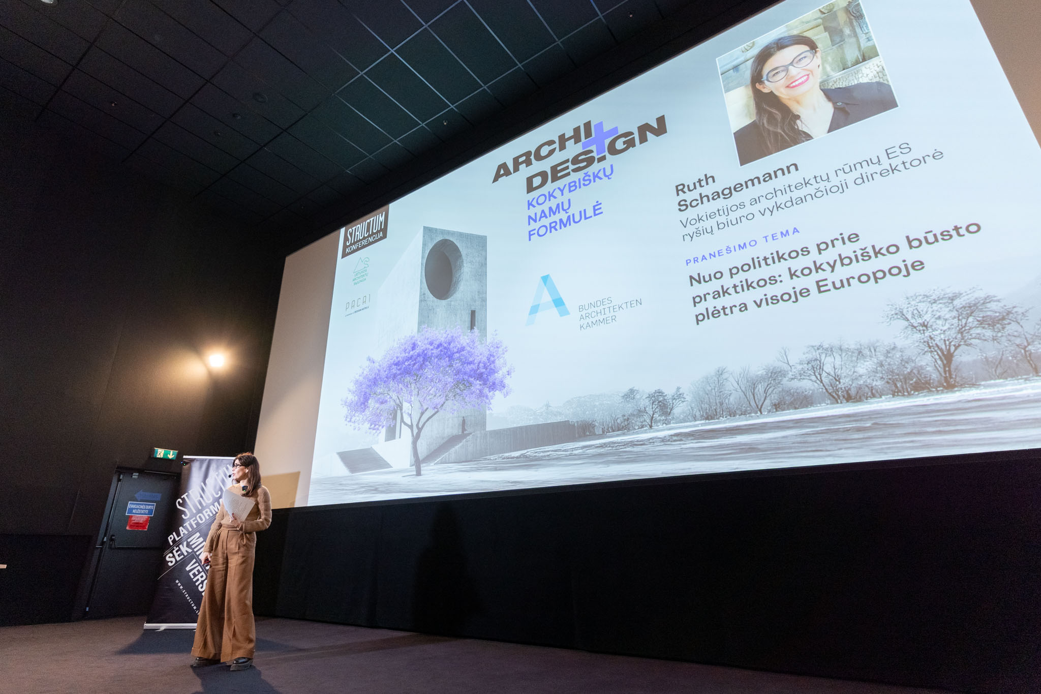 Konferencijos tarptautinį kontekstą išplėtė Ruth Schagemann, Vokietijos architektų rūmų ES ryšių biuro vykdančioji direktorė. Pranešime „Nuo politikos prie praktikos: kokybiško būsto plėtra visoje Europoje“ ji pristatė „New European Bauhaus“ iniciatyvą, grindžiamą trimis principais – tvarumu, grožiu ir bendruomeniškumu. Pasak pranešėjos, kokybiškas būstas šiandien yra ne tik architektų ar vystytojų, bet ir politinių sprendimų klausimas, formuojantis ilgalaikę Europos miestų ir bendruomenių viziją.
