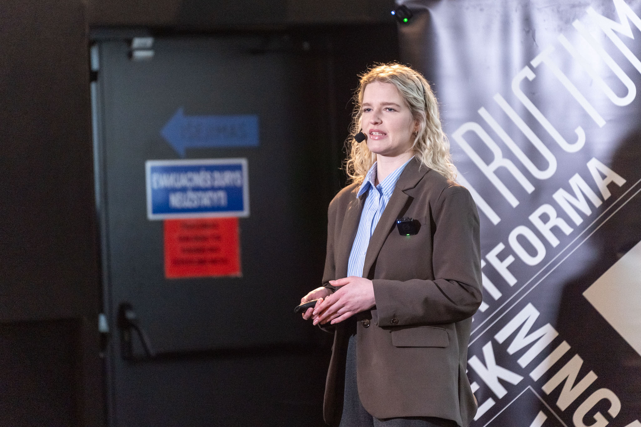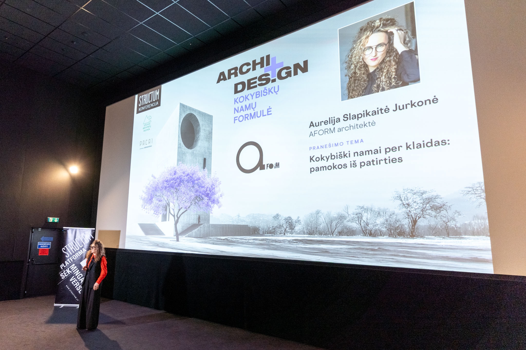 Konferenciją užbaigė Aurelija Slapikaitė-Jurkonė, AFORM architektė, pranešime „Kokybiški namai per klaidas: pamokos iš patirties“ pasidalijusi realių projektų istorijomis. Ji pristatė atvejus, kai iš pradinių klaidų ar netikėtų iššūkių gimė išskirtiniai ir įsimintini sprendimai. Architektė priminė, kad kūrybiniame procese svarbu nebijoti ieškoti ir klysti – dažnai būtent tuomet atsiranda didžiausia vertė.