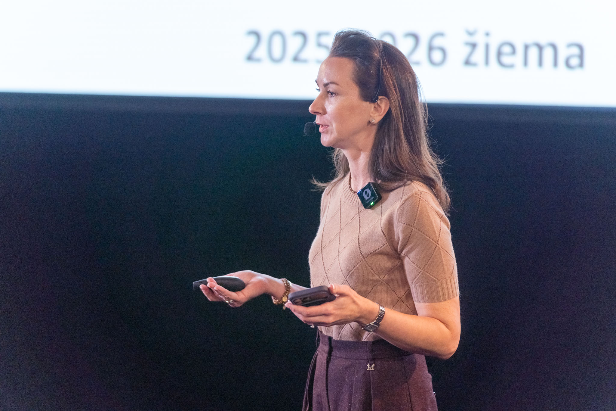 Pirmoji į sceną žengė Simona Skardžiuvienė, DOLETA atstovė, savo pranešime „Gyvenimo kokybė prasideda namuose“ kalbėjusi apie medienos vaidmenį kuriant jaukią ir ilgaamžę gyvenamąją aplinką. Pasak jos, langai architektūroje yra daugiau nei konstrukcinė būtinybė – tai ryšys su aplinka, šviesos ir šilumos šaltinis. Mediena puošia namus tiek iš vidaus, tiek iš išorės, o ypač žiemą, kai už lango vyrauja minusinė temperatūra, mediniai langai kuria ne tik fizinę, bet ir emocinę šilumą.