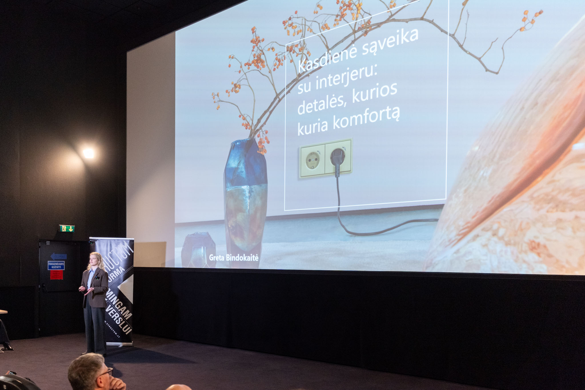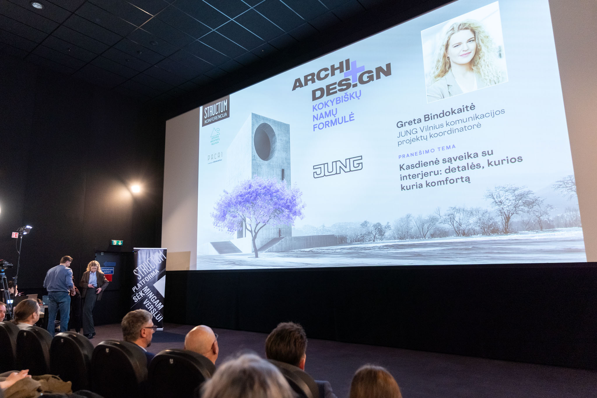 Kasdienės sąveikos su interjeru temą plėtojo Greta Bindokaitė, JUNG Vilnius komunikacijos projektų koordinatorė. Pranešime „Kasdienė sąveika su interjeru: detalės, kurios kuria komfortą“ ji pabrėžė, kad namų jaukumas dažnai slypi detalėse – jungikliuose, paviršiuose, spalvose, kurias liečiame ar matome kasdien. Būtent šios, iš pirmo žvilgsnio mažos, detalės kuria emocinį ryšį su erdve ir leidžia žmogui pasijusti tikrai namuose.