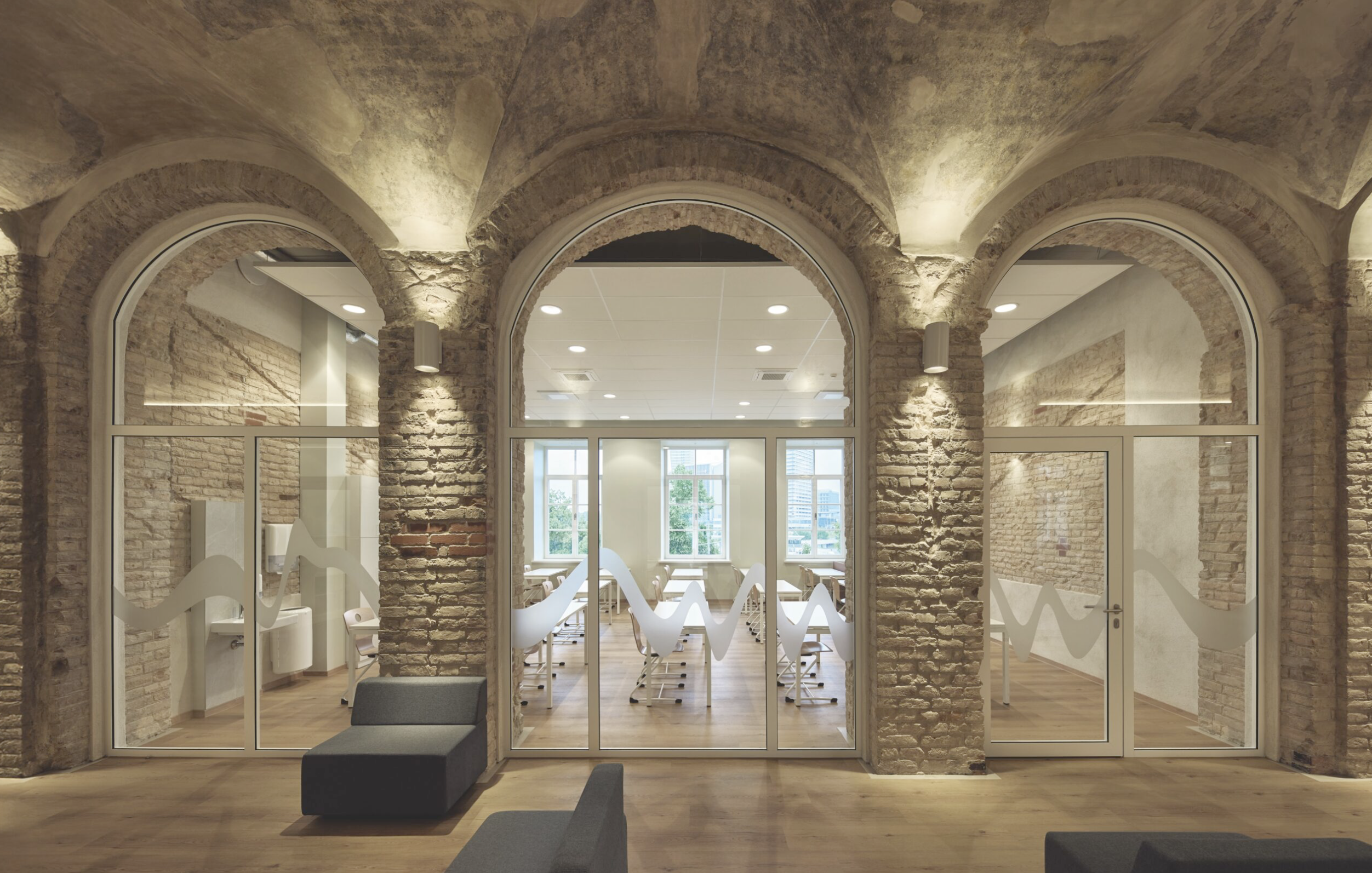 „Archinovos“ sprendinių pagrindu atkurtos visų keturių istorinių pastatų vidaus erdvės, restauruotos ne tik detalės, bet ir istorinės angos, laiptai, taip pat numatytos naujų vertikalių ryšių (laiptų ir liftų) vietos istoriniuose pastatuose. Iš esmės istorinės erdvės dabar tokios, kokios buvo XIX a.