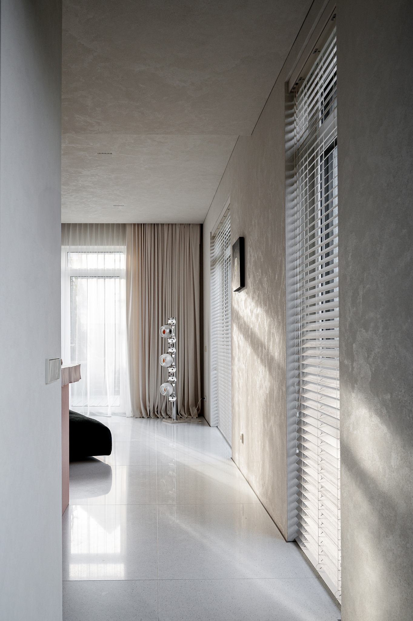 Jaukioms namo erdvėms sukurti pasitelktas pastelinių spalvų mikrocementas – universali, vientisa ir itin estetiška danga. Šią analogų rinkoje neturinčią ispanišką sistemą projekto lubų bei sienų apdailai tiekė ir visus jos sprendinius įgyvendino įmonė „Decorum“. Interjero architektės pageidavimu įmonės darbuotojai specialiai šiems namams sukūrė šviesaus pajūrio smėlio atspalvio mikrocementą.