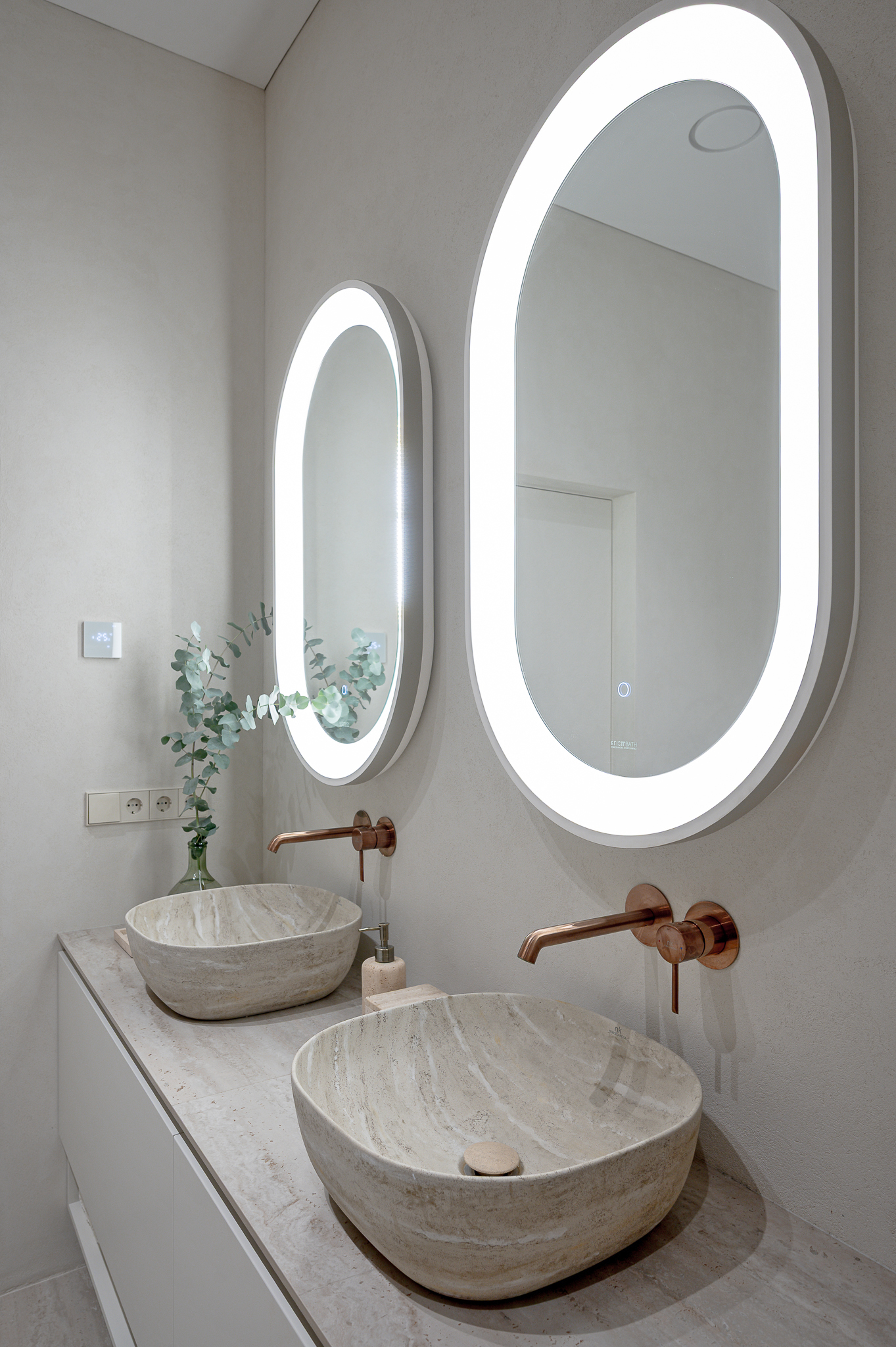 Antrajame aukšte jaukumo suteikia net grindų danga – šilko švelnumo minkštas kilimas, kuriuo labai malonu vaikščioti basomis. Pagrindiniame vonios kambaryje, išklotame travertino plytelėmis, ypatinga nuotaika kuriama šlifuoto vario maišytuvais ir išmaniaisiais lieto akmens veidrodžiais.