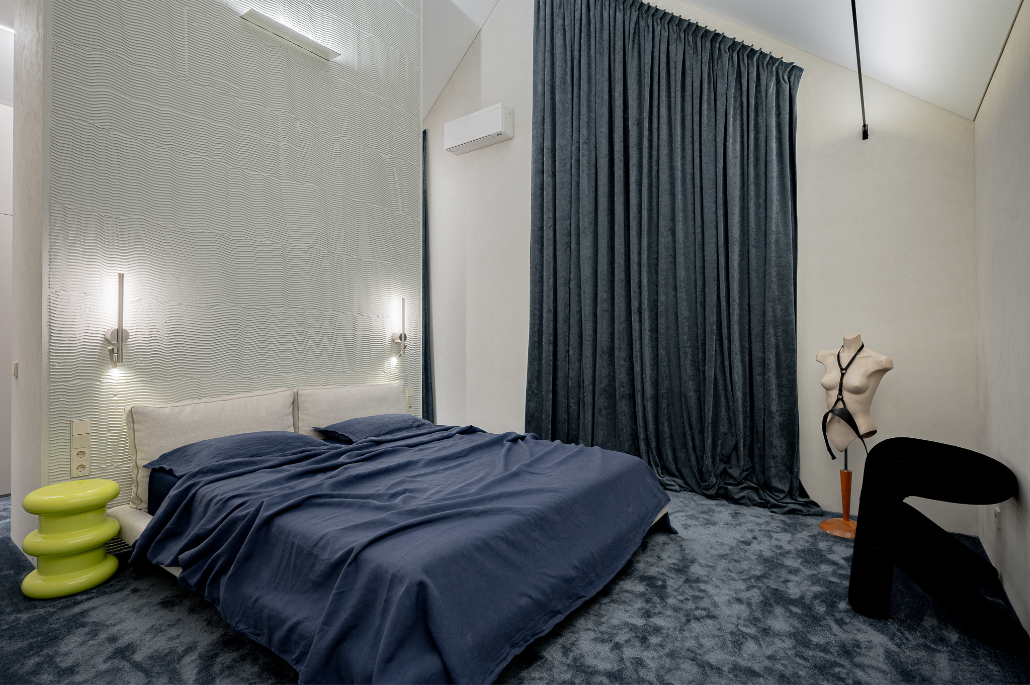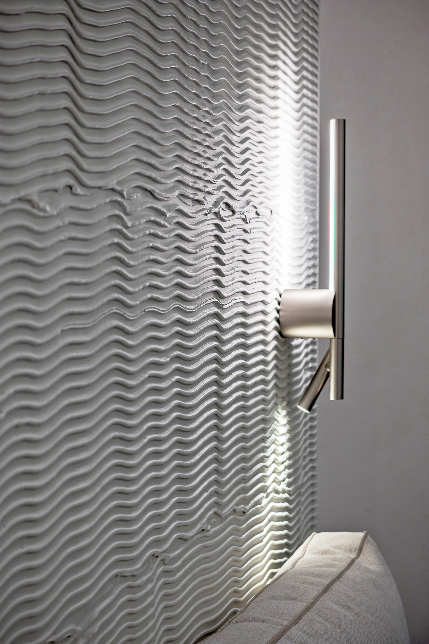 „Kai dekoratorius kūrė miegamojo akcentinę sieną, paprašiau jo horizontaliai šukuoto dekoro idėją įgyvendinti nelygiomis linijomis, šiek tiek stabtelėjant, pasvyruojant lyg truputį apgirtus. Jis puikiai suprato, ko aš noriu“, – juokiasi interjero architektė ir priduria, kad svarbiu akcentu tapo sienos viršuje įtaisytas veidrodinis dizainerio Davide’o Groppi šviestuvas – jis ne tik sukuria šviesos aureolę, bet ir sustiprina sienos dekoro įspūdį.