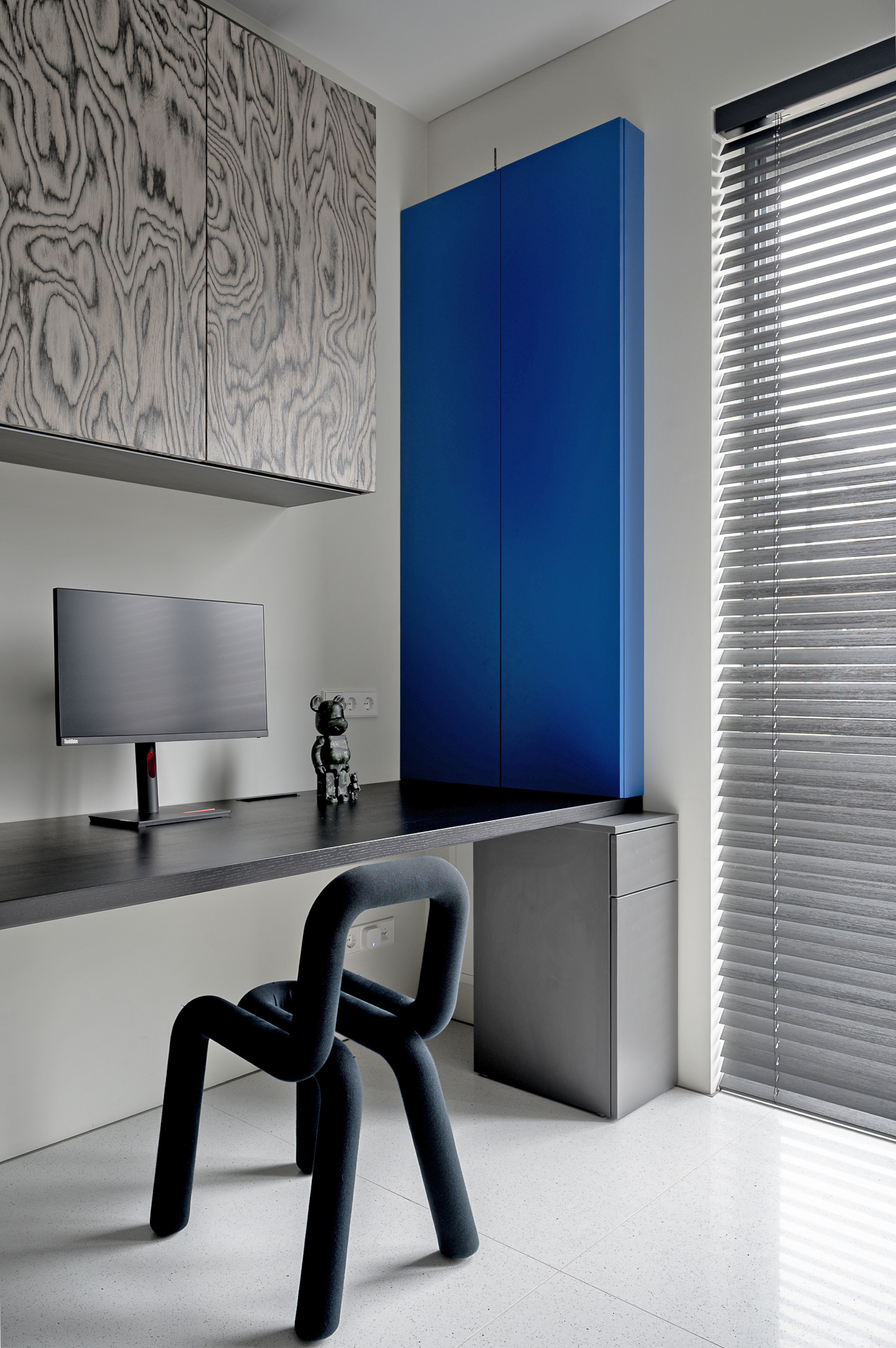 Darbo kambario akcentiniam baldui panaudota nuostabi pilkai juoda ALPI medžio lukšto plokštė, kaip kontrastas pasirinkta ryškiai mėlyna spintelė greta. Prie medžio masyvo stalo puikiai dera neįprastos formos juoda Prancūzijos dizaino namų „Moustache“ kėdė „Bold“. Ši kėdė, sudaryta iš vamzdinių metalinių dalių, apgaubtų storu poliuretano ir tekstilės užvalkalu, eksponuojama Moderniojo meno muziejuje (MoMA) Niujorke.