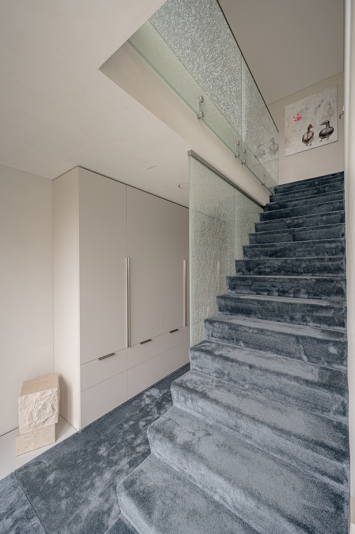 Abiejų aukštų sienos ir lubos dekoruotos mikrocementu. Pasirinkti raštai ir tekstūros optiškai minkština erdvę ir suteikia jai gyvybingumo.