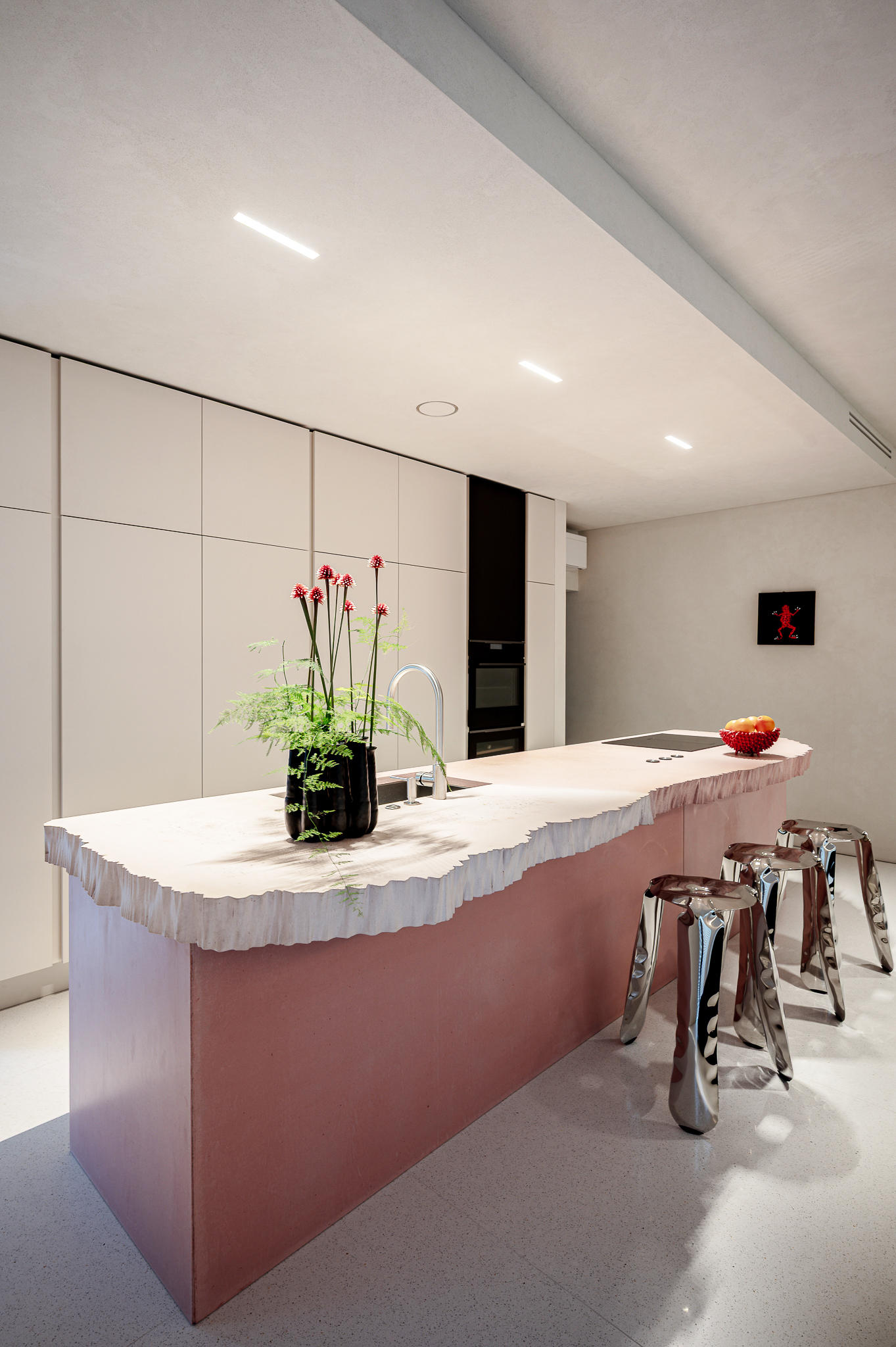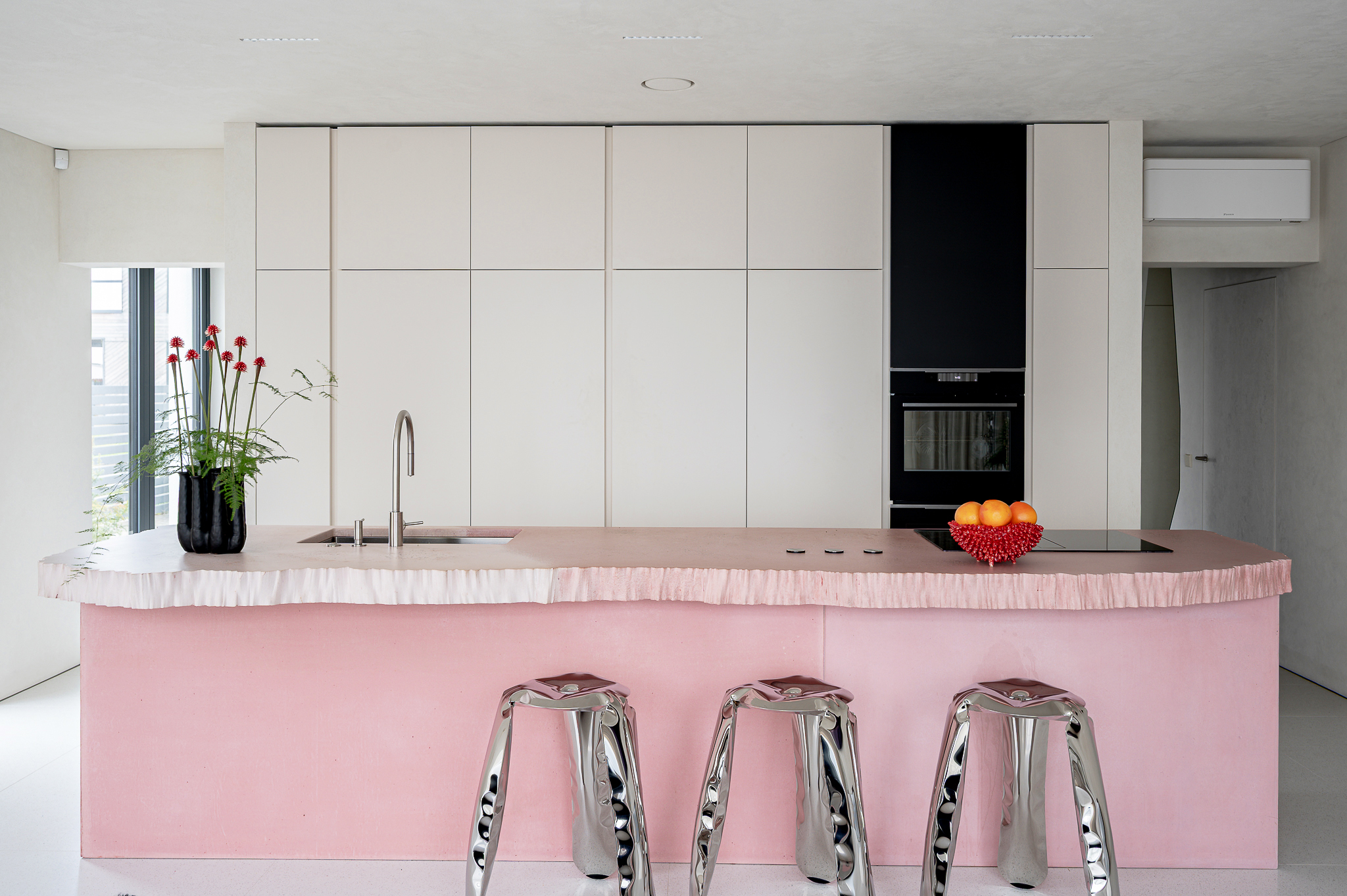 Unikalios formos brutalaus dizaino virtuvės sala ne mažiau stebina nestandartine švelniai rožine spalva.