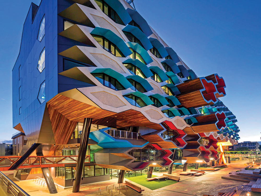 „La Trobe“ molekulinio mokslo instituto įspūdingas pastatas, priklausantis „La Trobe“ universiteto Melburno miesteliui, įkvėptas molekulinių struktūrų – to, kas jame tiriama. Jo langai primena susijungusius atomus, o pastato stulpai yra X ir Y formos, kad primintų chromosomas. Projektas turėjo esminį poveikį miestelio tapatybei ir architektūrai, kuri anksčiau buvo labai tradicinė. Pastatas suprojektuotas atsižvelgiant į konkrečią universiteto mokslo sritį, aplinka skatina studentus tapti tyrėjais ir mokslo pasaulio lyderiais. Žemesniuose pastato lygiuose yra bakalauro studijų erdvės, kuriose telpa iki 160 studentų, o viršutiniuose įrengtos mokslinių tyrimų laboratorijos. Kitose bendrose erdvėse yra didelė konferencijų salė, darbuotojų poilsio kambarys ir neoficialių susitikimų erdvės.