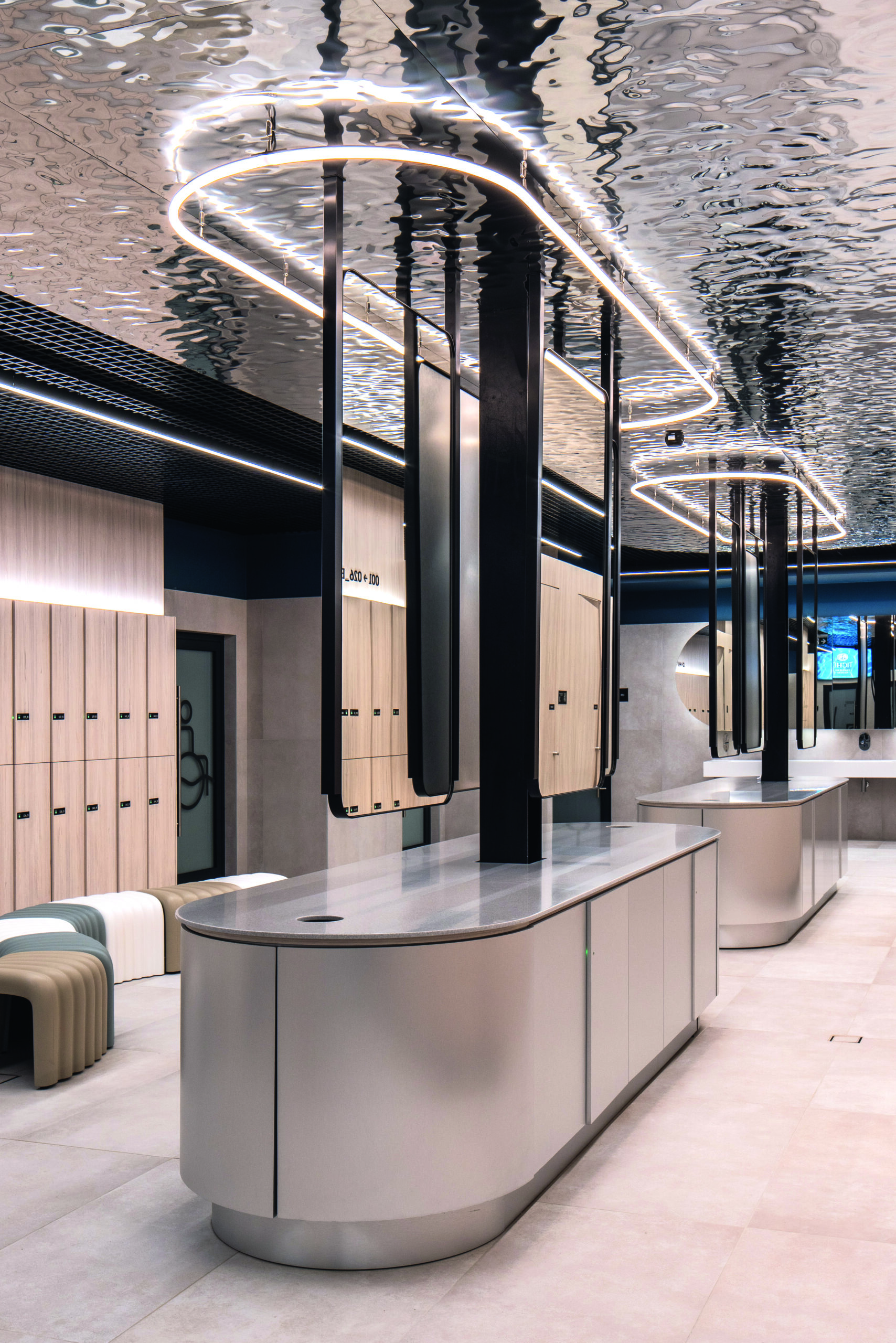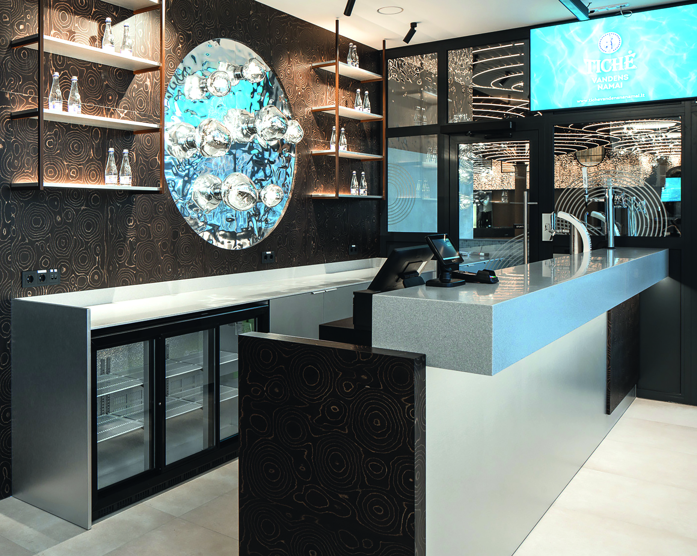 Įmonė „Brasa“ prie vientiso ir vizualiai išraiškingo interjero sprendimo įgyvendinimo prisidėjo į objektą pristačiusi daugiau nei 500 kv. m austrų gamintojo SIBU DESIGN dekoratyvinių plokščių „SL Ocean“. Veidrodinė plokščių paviršiaus danga pagaminta iš kompozitinių polimerinių medžiagų (PET ir HIPS) ir išsiskiria dinamiška, vandenyno judėjimą primenančia tekstūra bei šviesos atspindžių žaismu. Plokštės paviršius reaguoja į aplinką, kinta priklausomai nuo apšvietimo ir kuria įtraukiantį erdvinį efektą – tarsi vanduo banguodamas kiltų sienomis iki pat lubų.