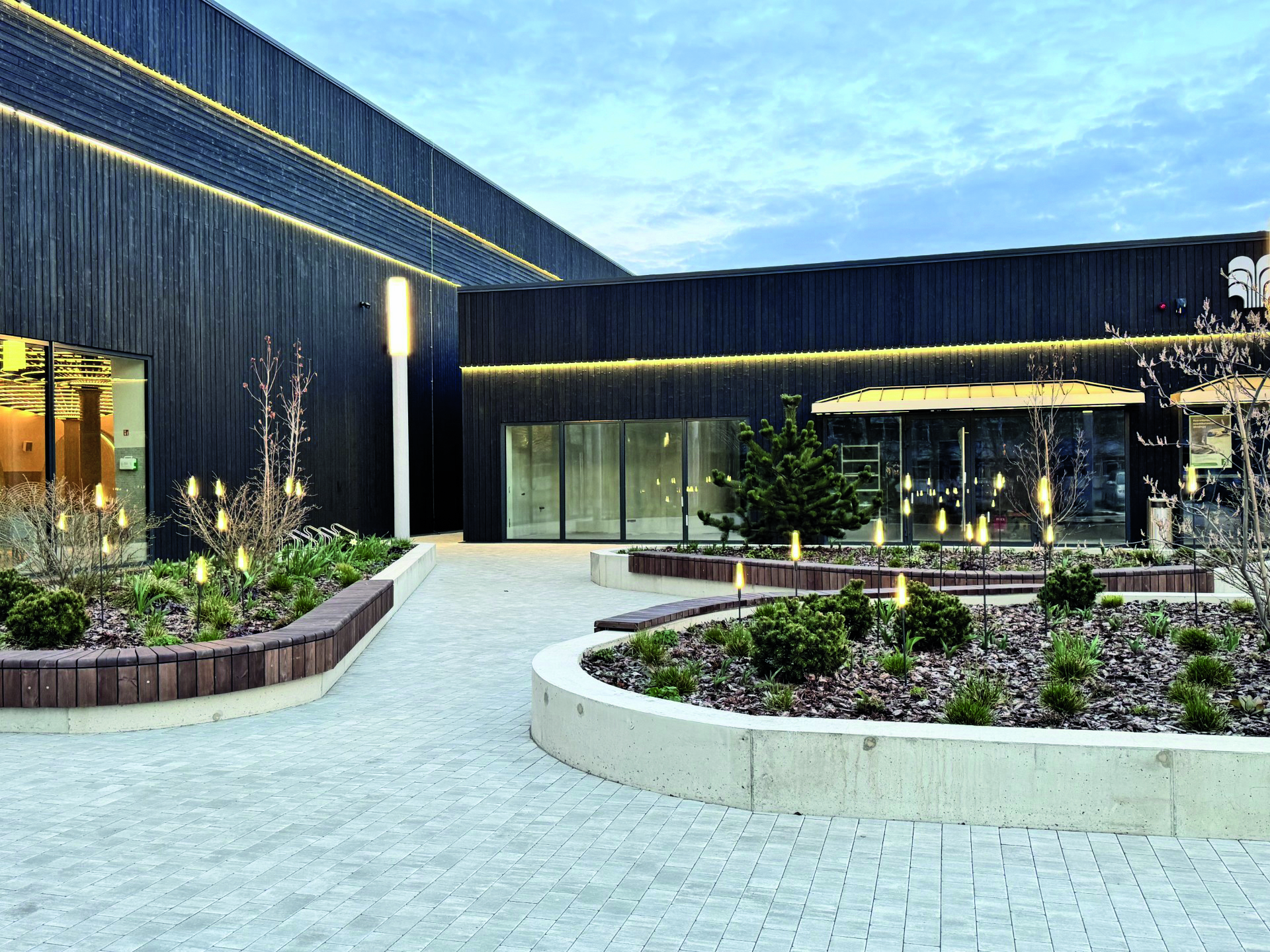 Jauki lauko aplinka sukurta įmonės „Betono mozaika“ produktais. Paklotos lengvojo transporto apkrovoms pritaikytos minimalios nuožulos juodos bei daugiaspalvės (MoonAnthracite) trinkelės „Prizma 8B“ – ne tik estetiška, bet ir tyli danga. Taip pat naudoti drenuojantys gaminiai, vejos ir gatvės bordiūrai.