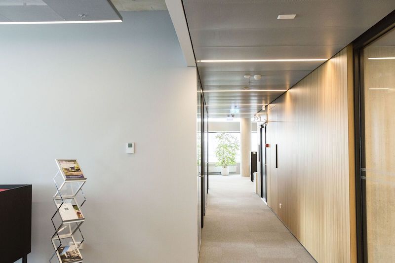 Apšvietimui valdyti suprojektuoti būvio jutikliai, kurie ne tik reaguoja į žmogų patalpose, bet kartu matuoja patalpos apšviestumą ir prireikus apšviečia patalpas šviesos diodų (LED) šviestuvais arba pritemdo lauko žaliuzėmis. Šviestuvai valdomi DALI tinklu, o būvio jutikliai ir žaliuzės „KNX PL-Link“.