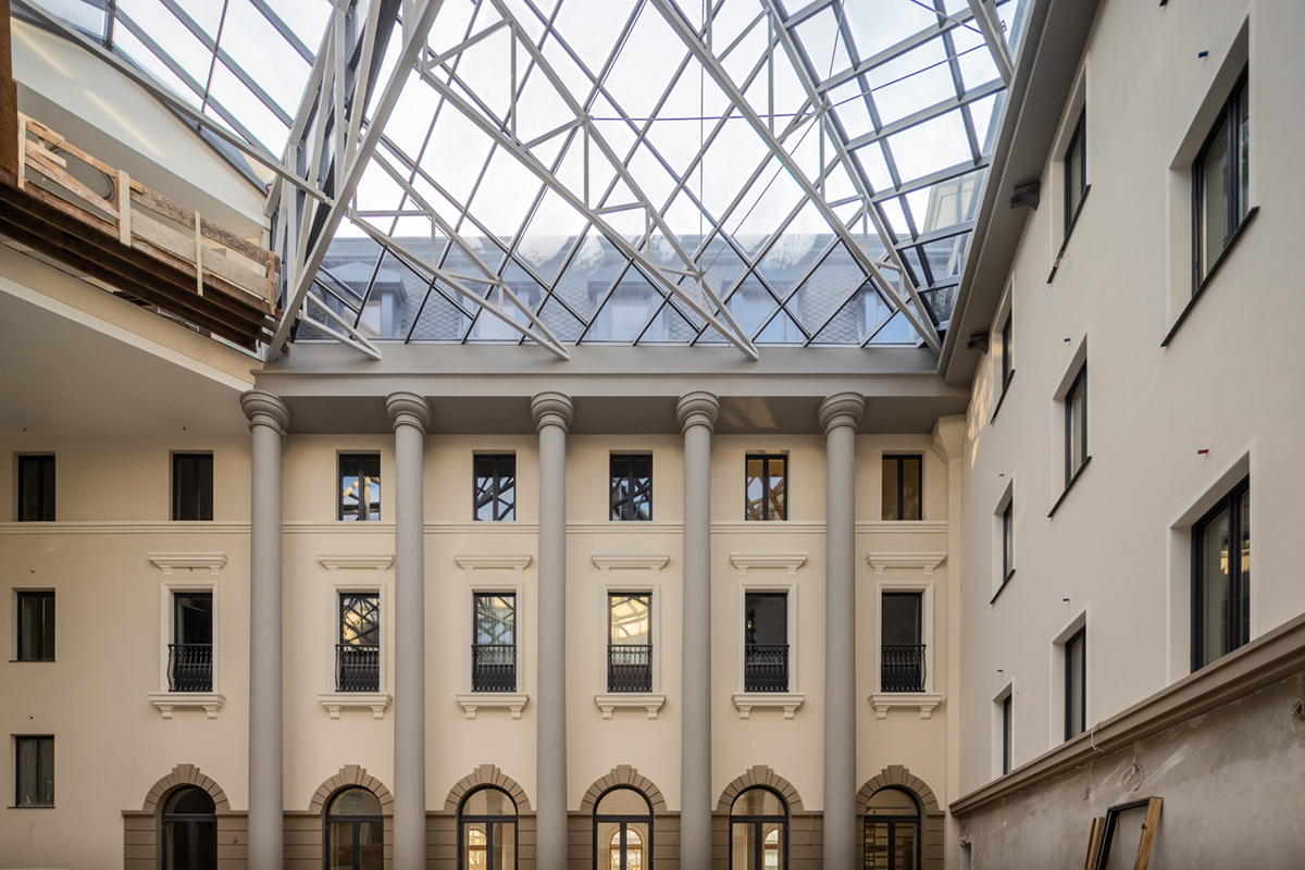 Rekonstruoto viešbučio komplekso pagrindinė erdvė ir jo ašis – didelis vidinis kiemas. Anksčiau buvusi atvira erdvė, dabar uždengta stikliniu stogu, tapo viešbučio pagrindiniu vestibiuliu. Jį formuoja iš keturių pusių supantys pastatų vidiniai fasadai.