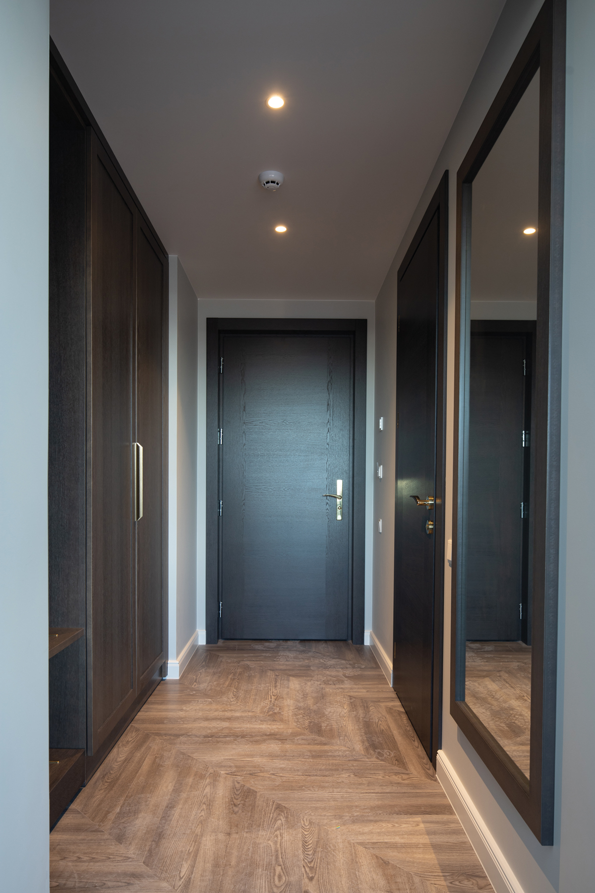 Šiam projektui architektai parinko modernios klasikos stiliaus, blizgaus žalvario spalvos elektronines rankenas „Salto XS4 One“, kurios puikia dera prie interjero dizaino. Tokios pat formos rankenos buvo parinktos ir vonios kambario durims. Vonios kambarių rankenos unikalios dėl įgyvendintos dizaino idėjos: rankena yra skirtingų spalvų abiejose durų pusėse – iš kambario rankena yra blizgaus žalvario spalvos (derinant prie interjero ir pagrindinio įėjimo į kambarį durų), o vonios kambario pusėje – blizgaus chromo spalvos (spalvą priderinant prie vonios spalvinės gamos).