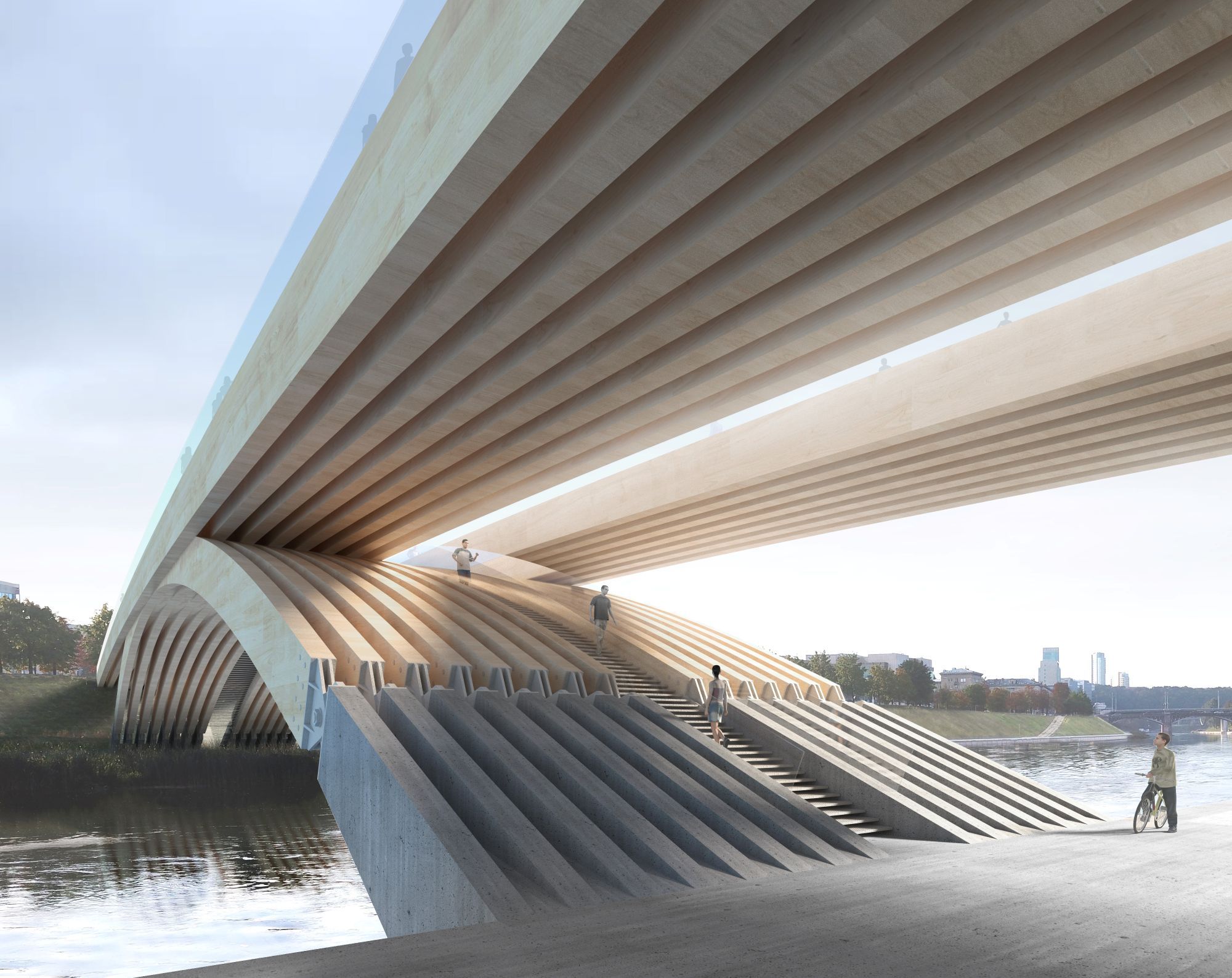 „Ši medžiaga natūraliai siejasi su Žvėryno charakteriu ir jo medinės architektūros tradicija. Mediena čia tampa ne tik konstrukcija, bet ir simboliu, jungiančiu gamtą, kultūrą ir šiuolaikinį miestą. Ji leidžia tiltui būti tvirtu, bet kartu lengvu, elegantišku ir artimu žmogui. Medžio paviršiai kuria šilumos ir jaukumo įspūdį, todėl tiltas tampa ne tik patogia jungtimi per upę, bet ir miesto akcentu, vieta būti ir žiūrėti į upę. Palyginti su metalu, mediena natūraliai įsilieja į aplinką ir slopina triukšmą bei vibracijas, todėl juo vaikščioti bus maloniau. Be to, mediena veikia kaip anglies dioksido saugykla, o tai reiškia, kad tiltas ne tik mažina poveikį aplinkai savo gamybos metu, bet ir prisideda prie miesto klimato kaitos švelninimo“, – sako architektas A. Neniškis.