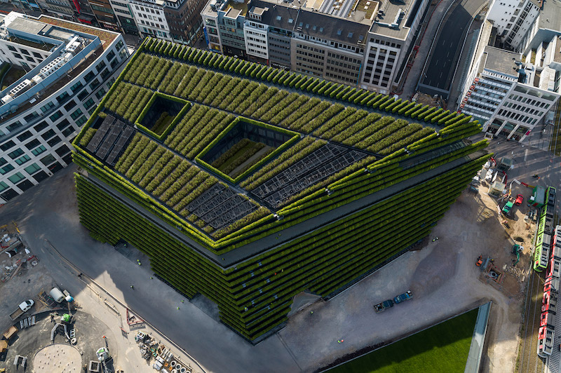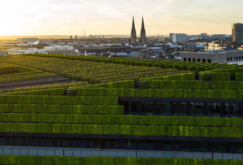 „Ingenhoven Architects“ Diuseldorfe, Vokietijoje, kuria „Kö-Bogen II“ biurų bloką, kurį sudarys aštuonių kilometrų gyvatvorės iš 30 000 augalų.