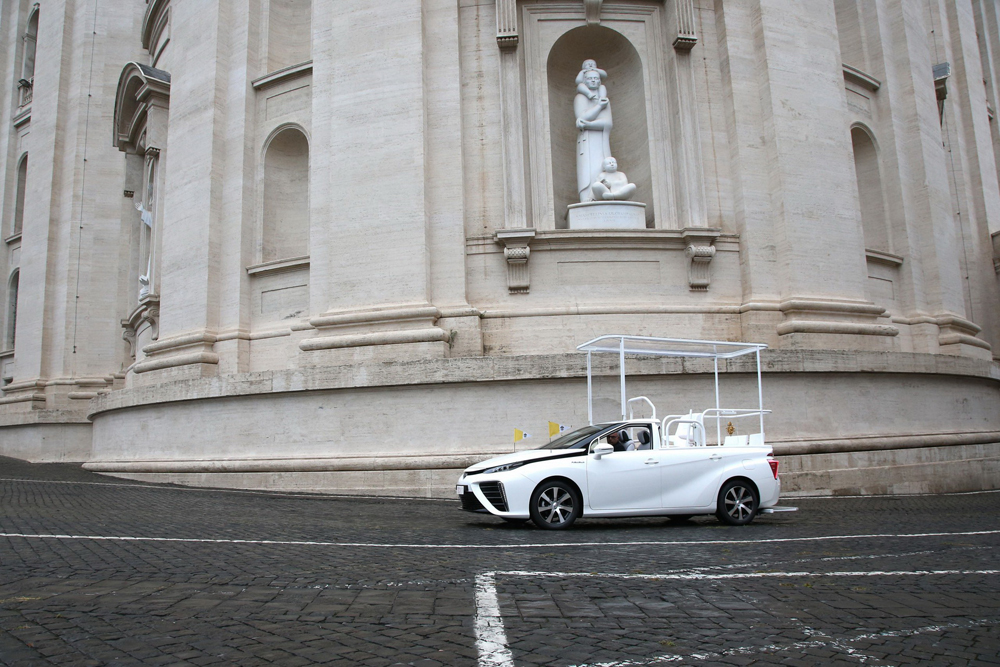 Specialiai modifikuotuose automobiliuose „Toyota Mirai“ vietoj galinės kėbulo dalies įrengta skaidri platforma, iš kurios popiežius galės sveikinti tikinčiuosius. Gamintoja „Toyota“ padovanojo šiuos automobilius Japonijos Katalikų bažnyčiai, o dabar vienas iš automobilių pasiekė Vatikaną. Popiežiui padovanotame 5,1 m ilgio ir 2,7 m aukščio „Mirai“ yra didelio intensyvumo šviesos diodų (LED) apšvietimo sistema, diplomatinių vėliavėlių laikikliai ir laipteliai prie galinių durelių, kad popiežius galėtų lengvai patekti į savo nulinės emisijos automobilio galinę sėdynę.